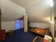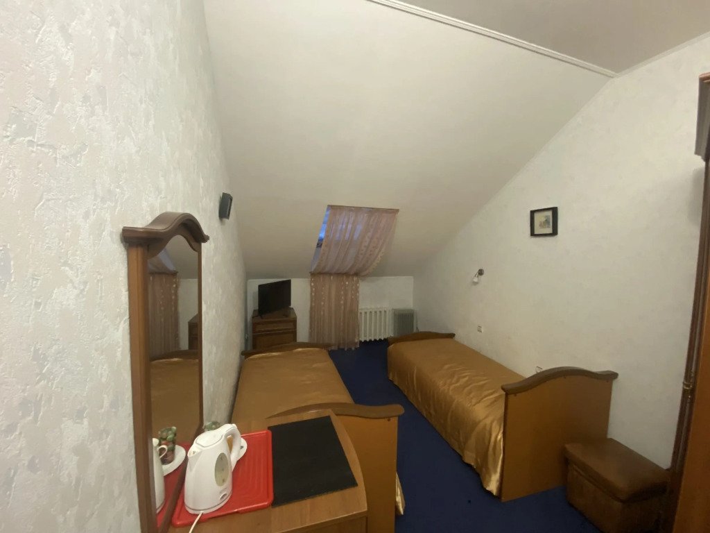 Wi-Fi, фен, вентилятор, утюг, душевая кабина, две односпальные кровати, шкаф для одежды, журнальный столик, пуфики, чайный набор, обслуживание номеров, чайник, ковровое покрытие, общая ванная комната, внешняя ванная комната, сушилка для белья, телевизор с плоским экраном, мини-холодильник, мансардные окна, фумигатор, услуги прачечной (платно), вешалки-плечики, мыло, без питомцевВ номере