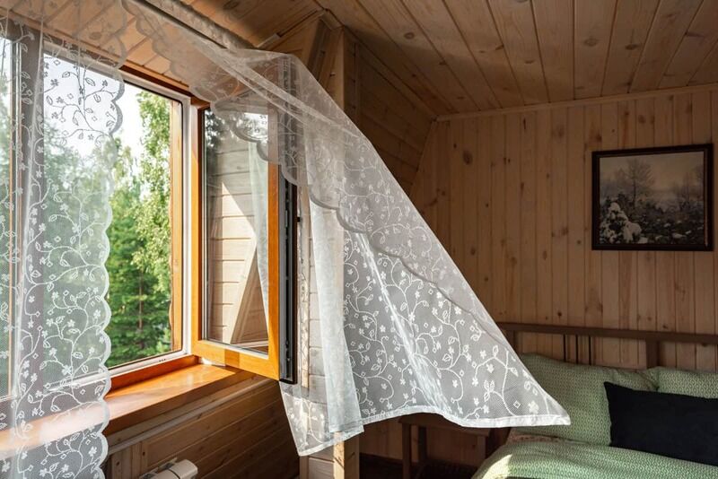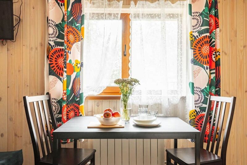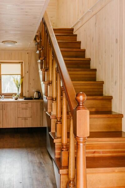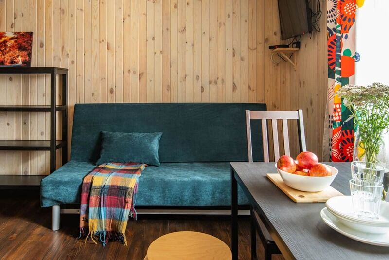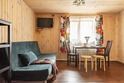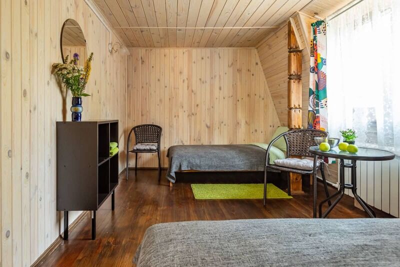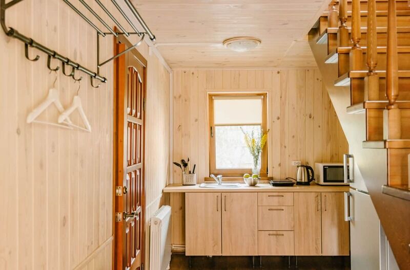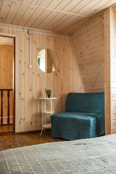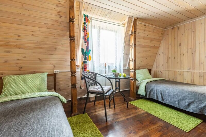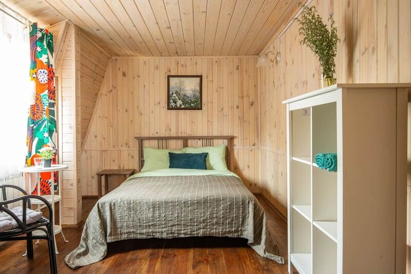 На первом этаже расположены кухня, гостиная и совмещенный санузел, на втором две спальни. Вы можете забронировать дом, в котором в обеих спальнях — двухспальные кровати или дом, где одна комната с двуспальной кроватью, другая — с двумя односпальными. Выбирайте вариант, который вам больше подходит!