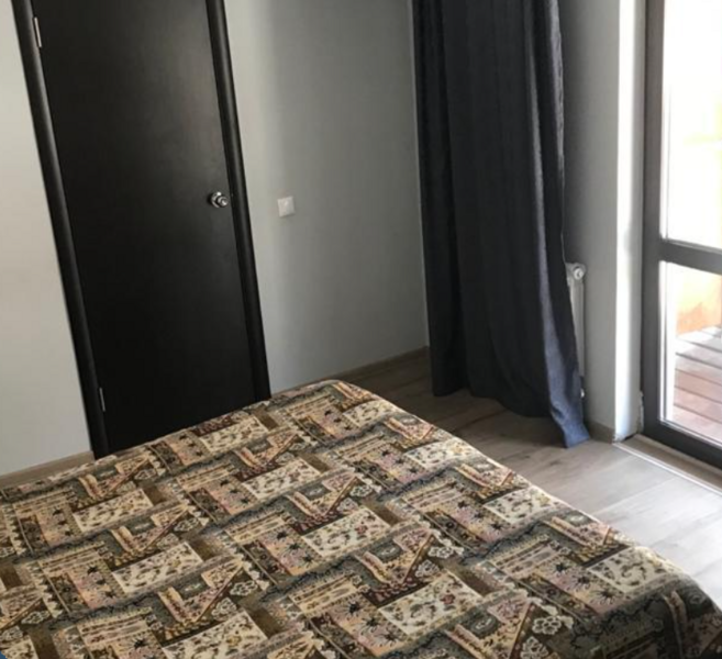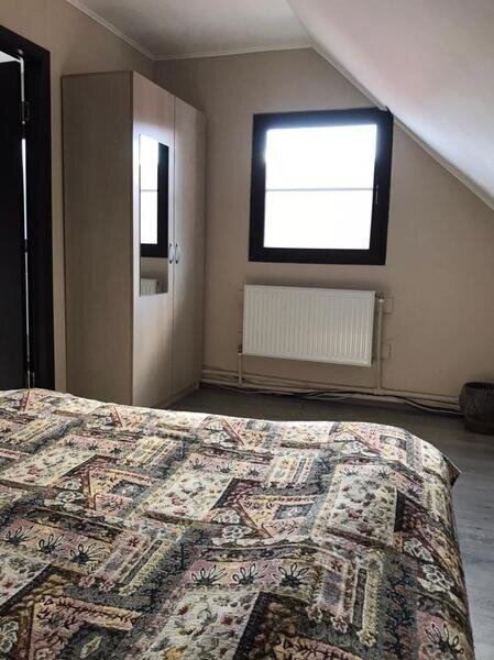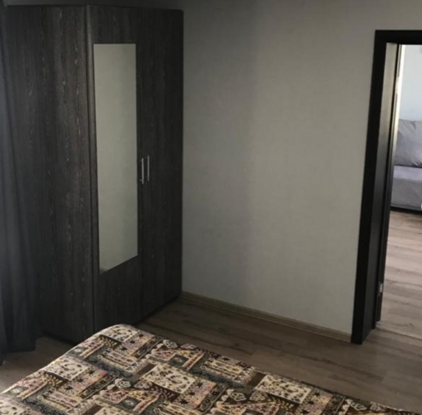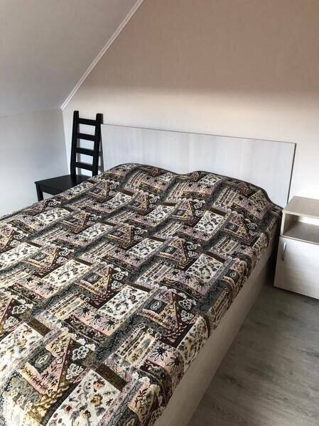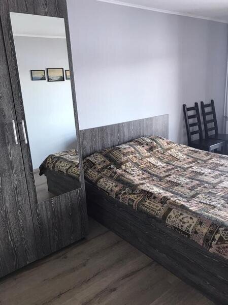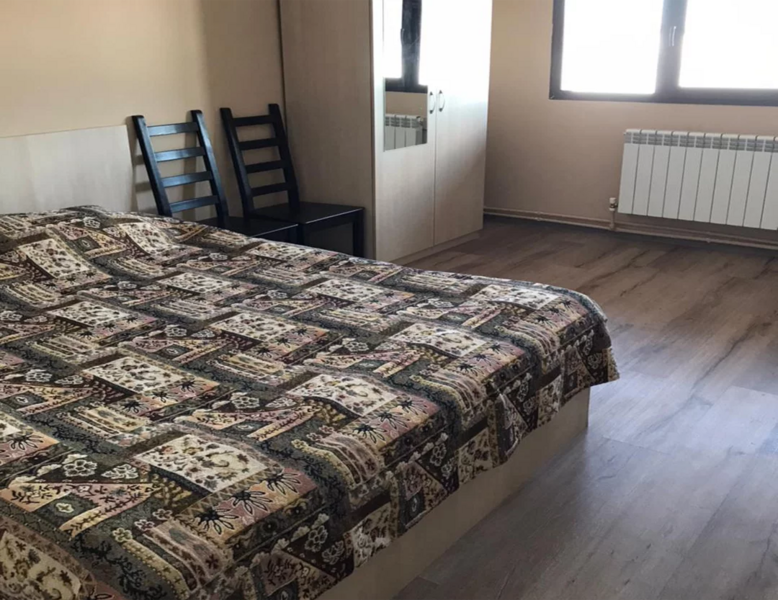 Двуспальная кровать, шкаф, тумбочка, два стула.