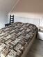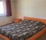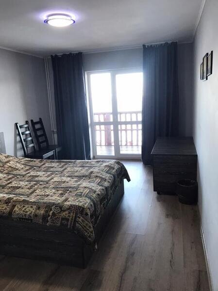 Двуспальная кровать, шкаф, тумба, телевизор, два стула. Вид с балкона на озеро.