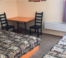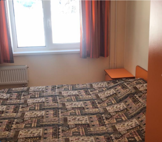 Две двуспальные кровати, шкаф, две тумбочки, стол и два стула. Вид из окна на двор.
