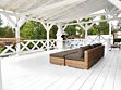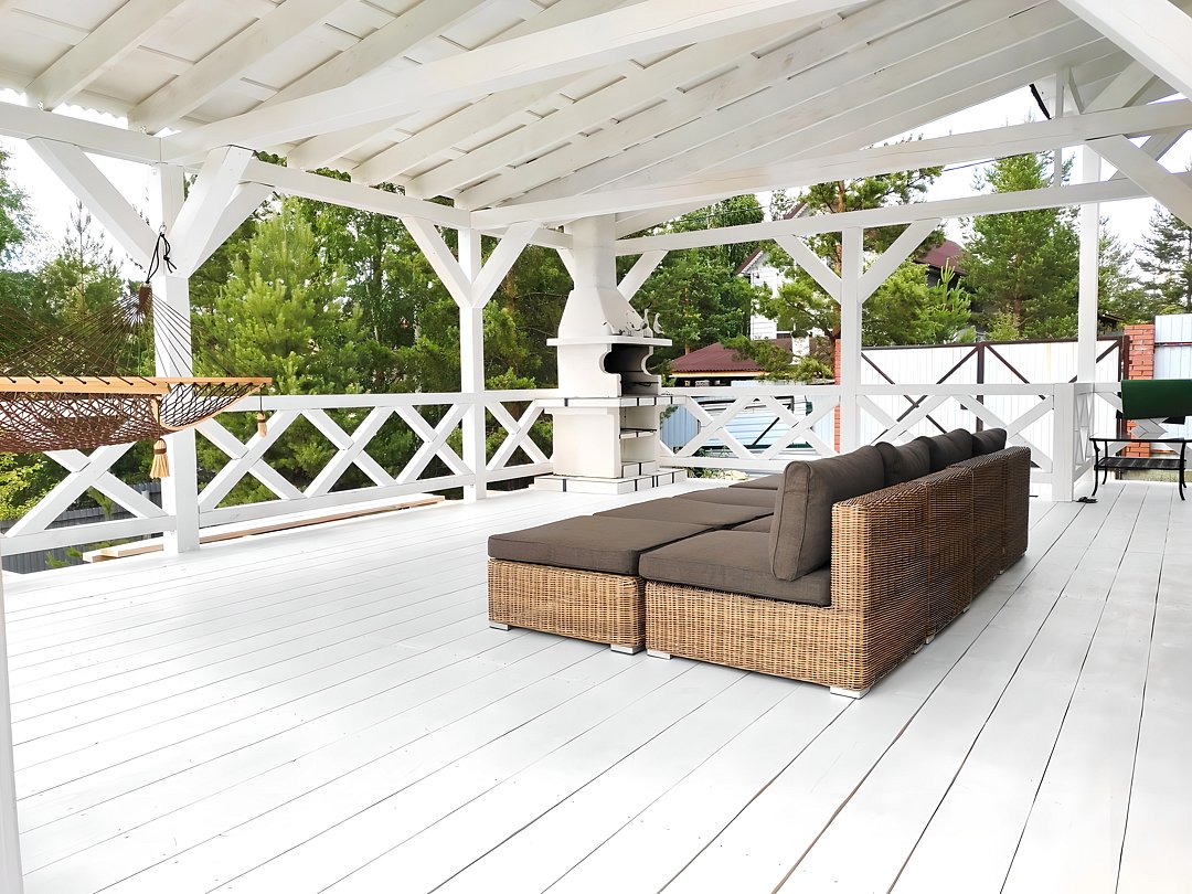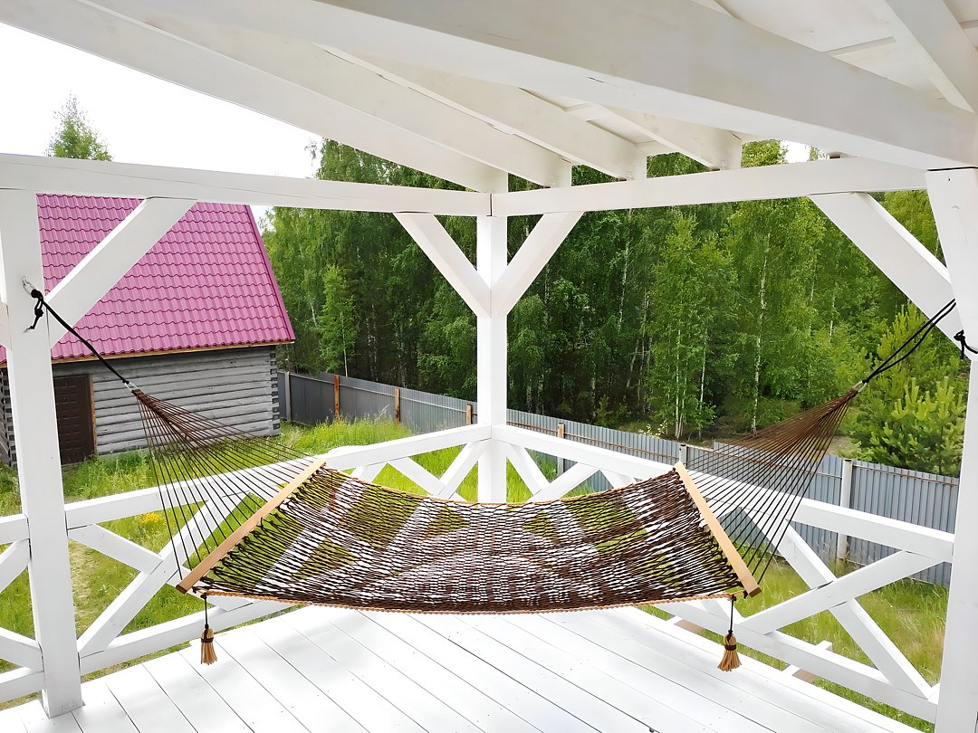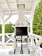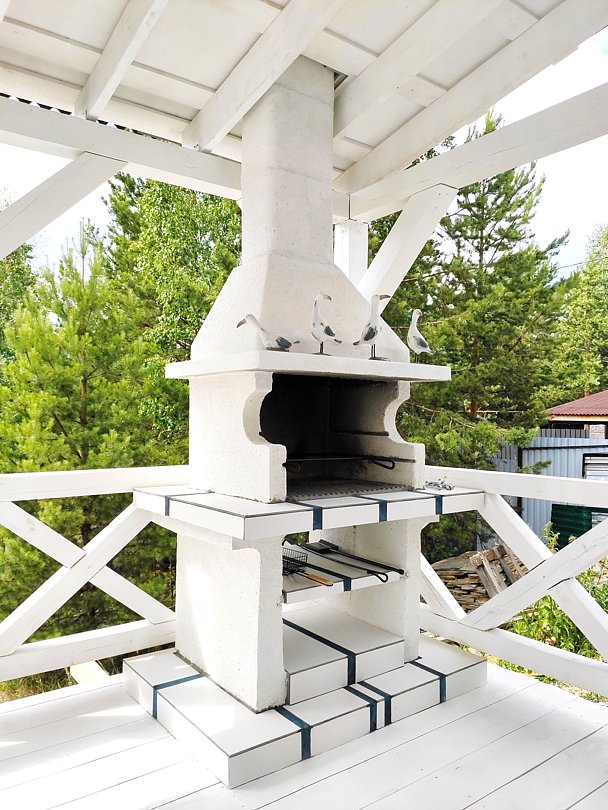 В белоснежной беседке расположена барбекю-печь, которая приглашает гостей насладиться готовкой на свежем воздухе. Здесь можно отведать вкусные блюда за столом или расслабиться в гамаке и на шезлонгах.