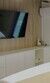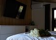 Возле кровати стоят комод и тумбы, над тумбой напротив кровати размещён ЖК-телевизор.