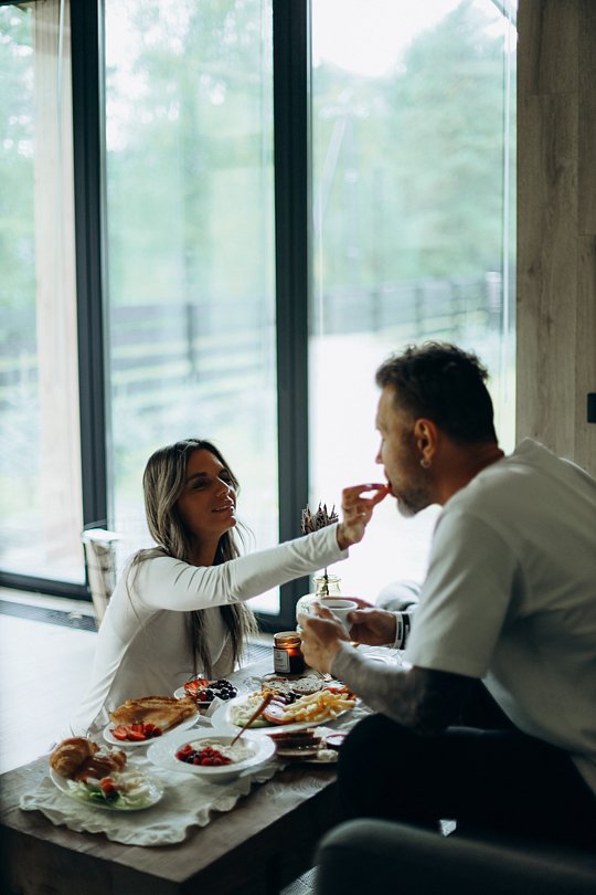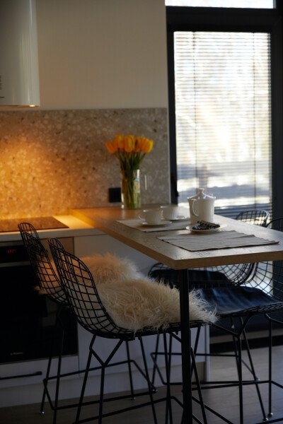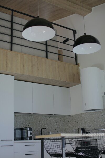 На территории апарт-отеля нет своего ресторана. Но оборудование кухни позволяет не испытывать неудобств по этому вопросу. Желающие могут заказать вечером доставку горячего завтрака в номер. Также возле каждого из домов есть своя мангальная зона.