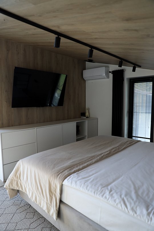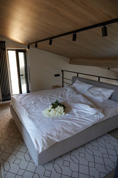 Второй этаж оснащён двухспальной кроватью с ортопедическим матрасом для более комфортного, спокойного сна.