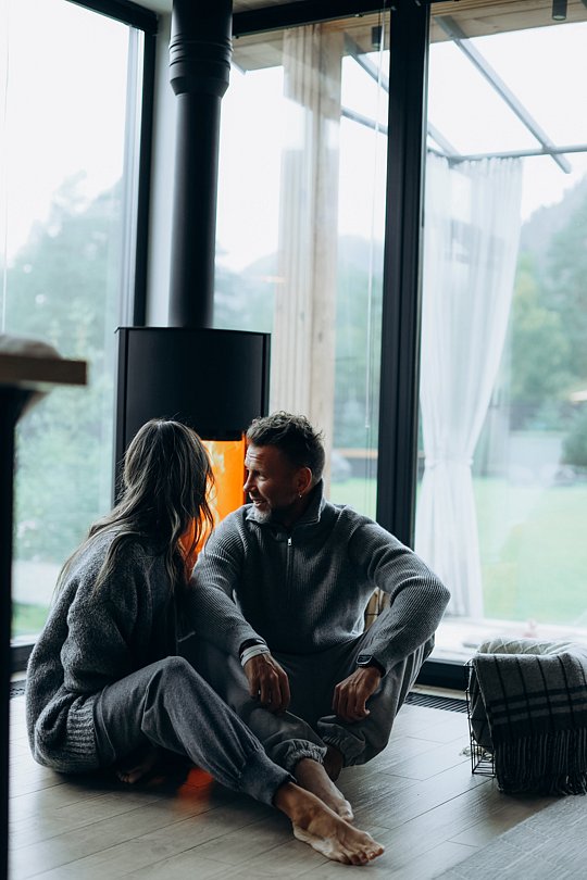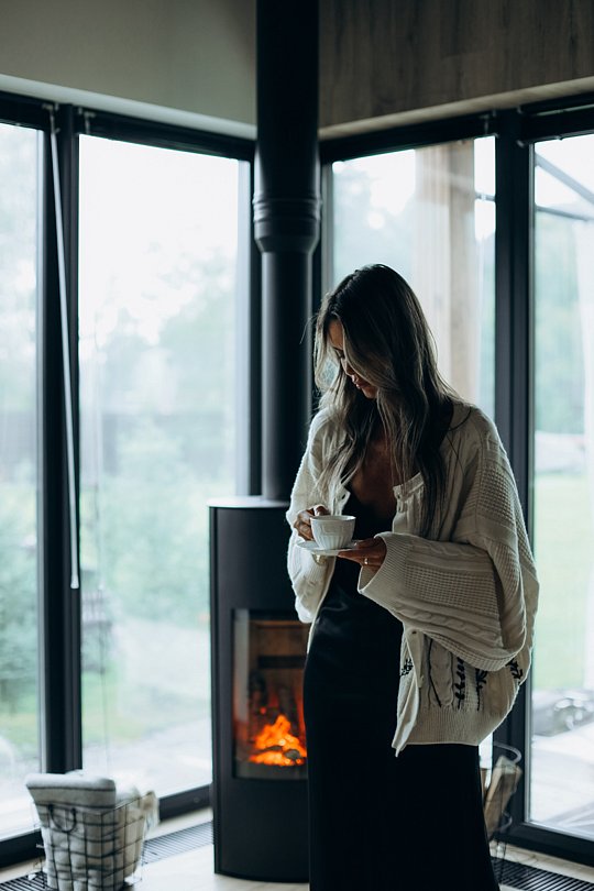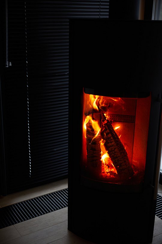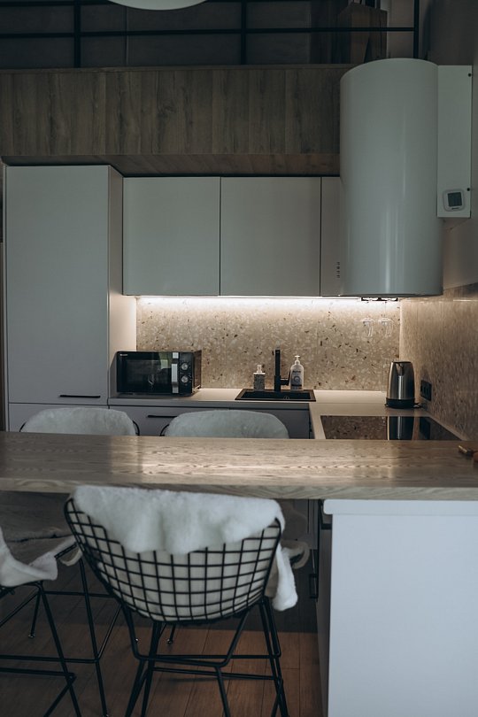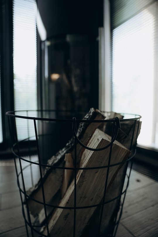 В доме находится полноценная кухня с духовым шкафом, микроволновой печью, холодильником, посудомоечной и стиральной машинами. У панорамного окна с видом на гору Селигур расположен дровяной камин. Ванная комната с тёплым полом оборудована душевой кабиной, санузлом и раковиной у окна.