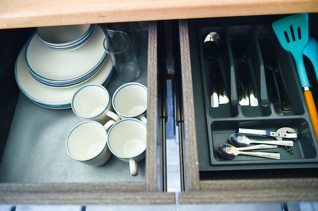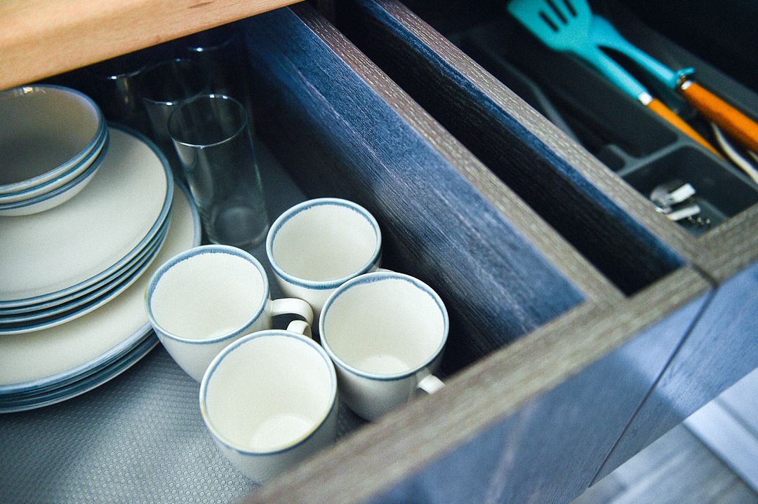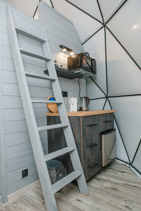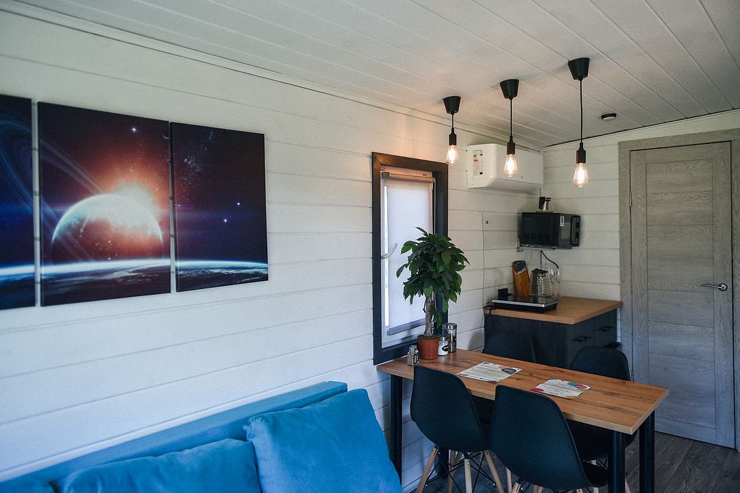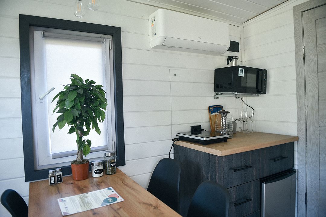 Зона кухни: микроволновая печь, холодильник, индукционная плита, посуда и столовые приборы для уютных посиделок.