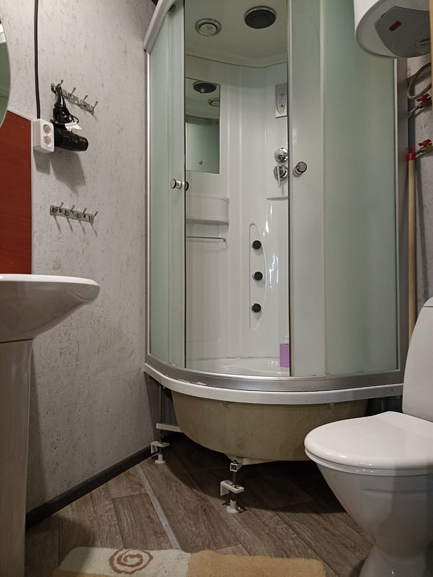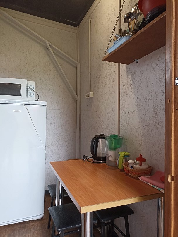 Также есть холодильник, чайник, микроволновая печь и набор посуды, санузел с душевой кабиной.
