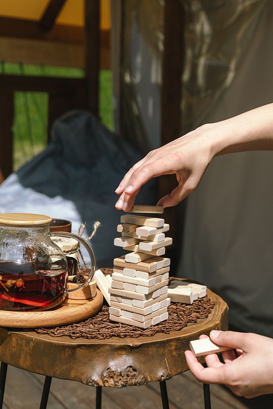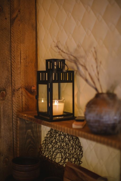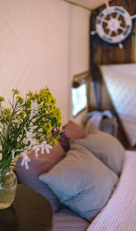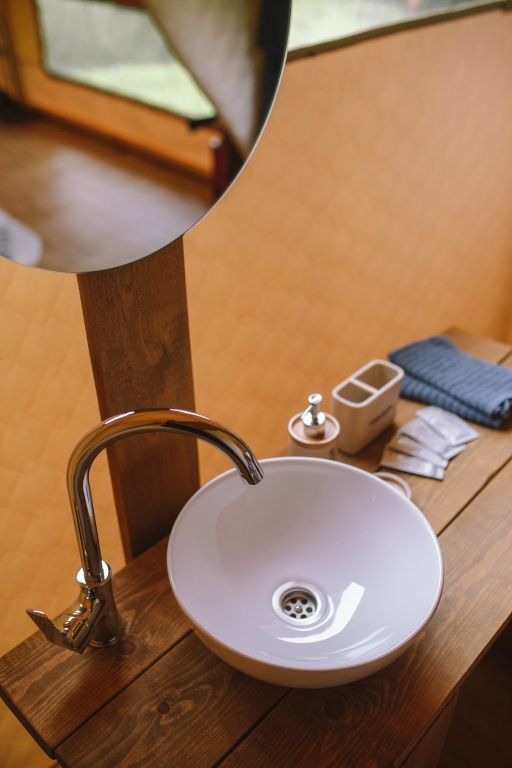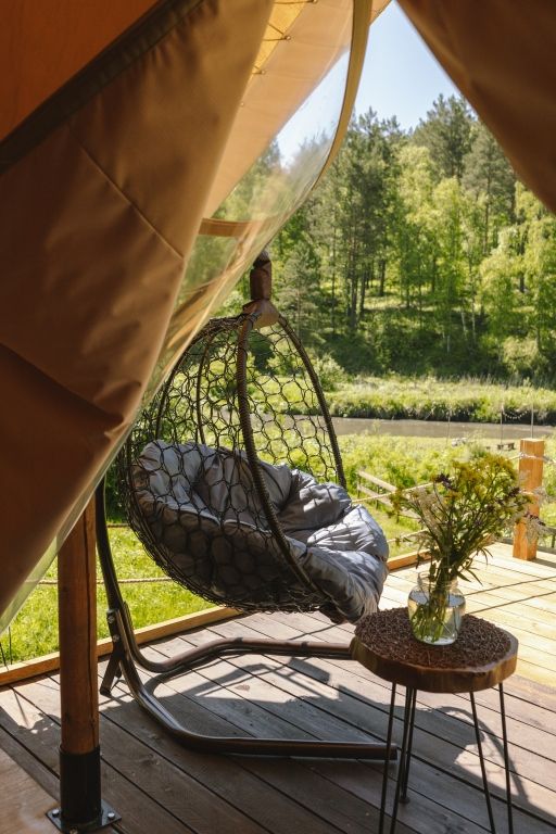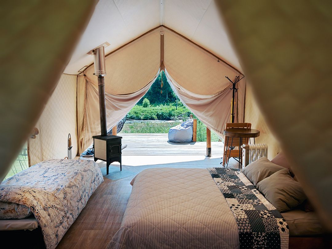 На территории всего два шатра, которые полностью оснащены всем необходимым для комфортного проживания. Внутри стоит удобная двуспальная кровать, для отопления есть дровяная печь со стеклянной дверцей. Ванная комната также находится в шатре и оснащена душем, туалетом и гигиеническими средствами.