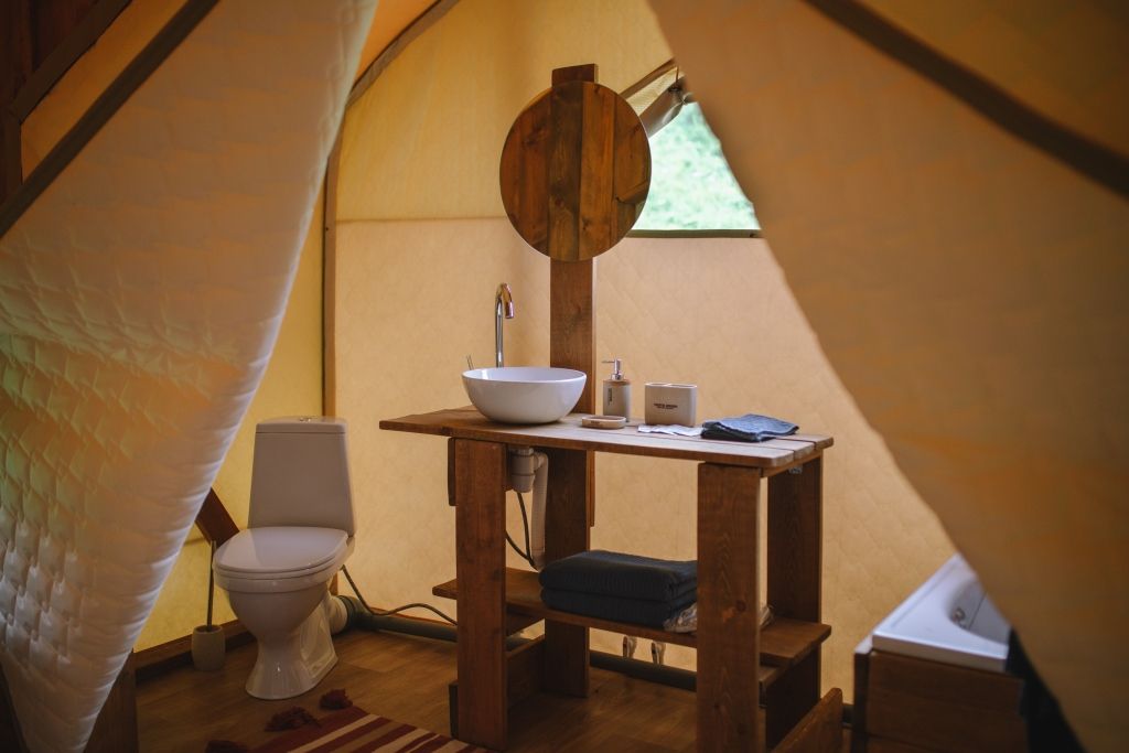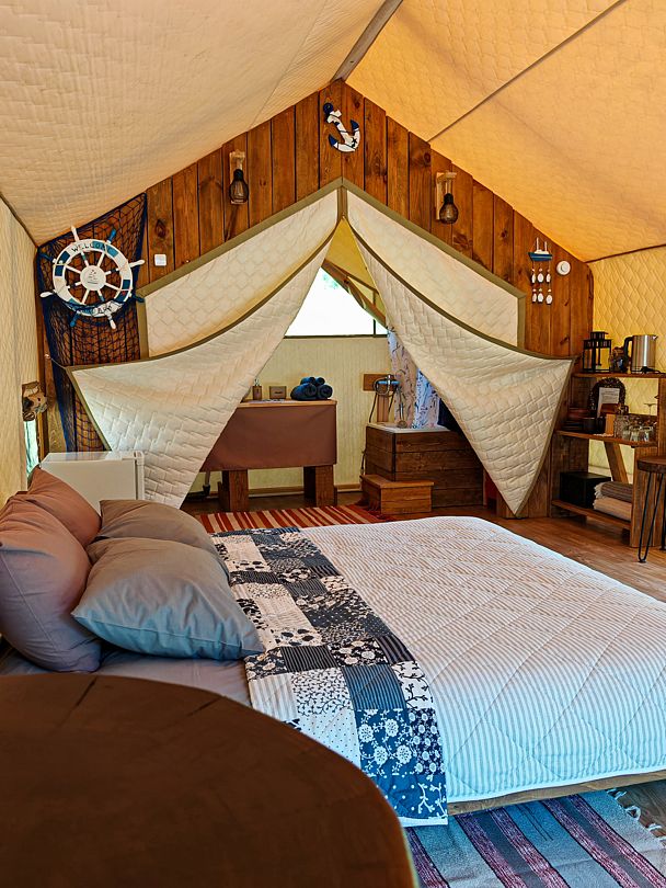 Шатер с удобной двуспальной кроватью, кухонной зоной и собственной ванной комнатой, оснащенной сантехникой, комплектом полотенец и халатов, а также гигиеническими средствами.