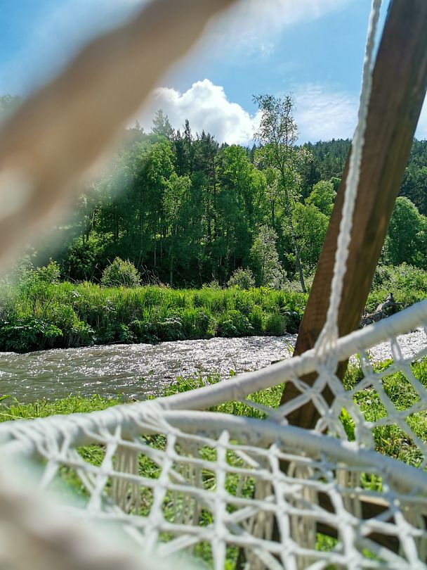 На берегу реки стоит банный чан, в котором гости смогут по-настоящему расслабиться. Разнообразить свой досуг можно, заглянув на конную ферму, которая находится в пешей доступности от глэмпинга.