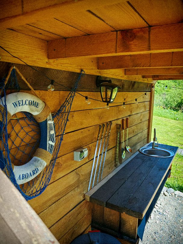 Обеденная зона оснащена однокомфорочной газовой плиткой, чайником и набором посуды, а снаружи имеется мангал.