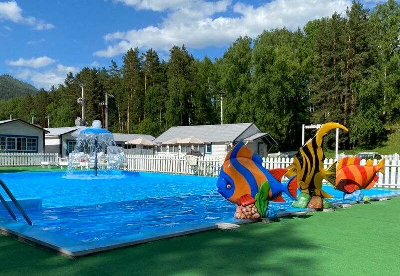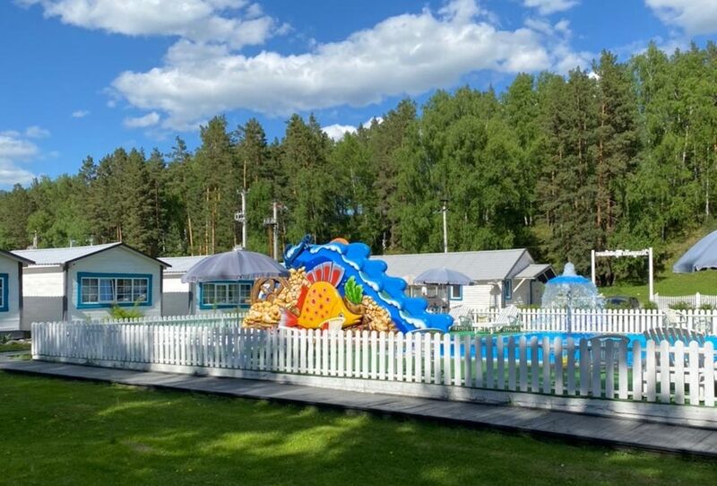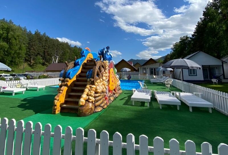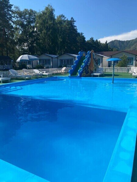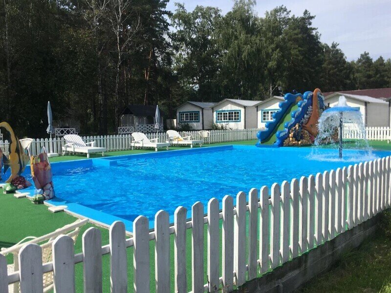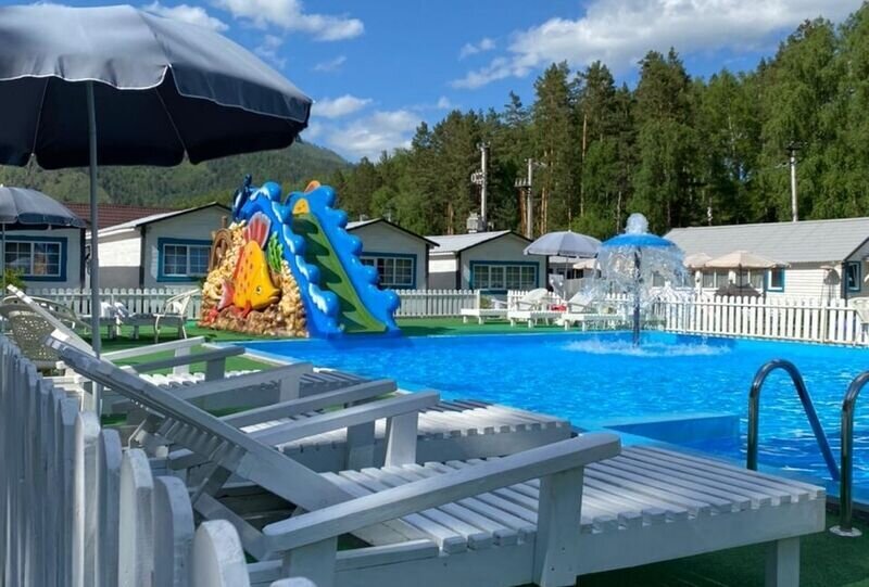 - пользование открытым летним бассейном, аквагоркой, шезлонгами и зонтами