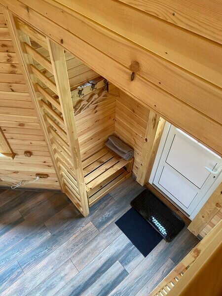 На первом уровне Вы сможете удобно проводить время на большом диване, также есть стильная обеденная (рабочая) зона, второй уровень под куполом в 5,5 м отдан под удобное спальное место с ортопедическим матрасом, мягкими подушками и белоснежным бельем. Пол в душевой сделан из катунских камешков, что обеспечит Вам массаж стоп и заряд бодрости после каждого приема душа.