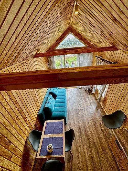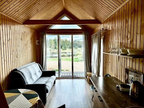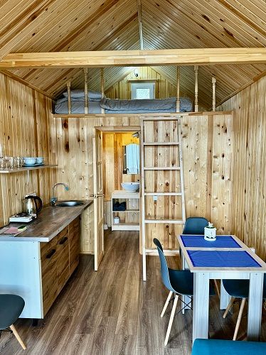 На площади в 24 квадратных метра расположилось деревянный настил для спанья с двуспальным матрасом и единой зоной гостиной комфортным двухместным диваном и панорамными окнами. Для вашего удобства его оснастили сан. узлом с душевой кабиной, холодильником, электроплиткой, чайником и телевизором. Конечно, есть wi-fi. Набор полотенец, набор посуды на 3 персоны.