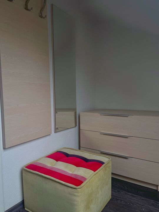 Спальня 1: две односпальные кровати, тумба, ночник, зеркало.