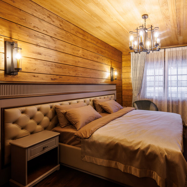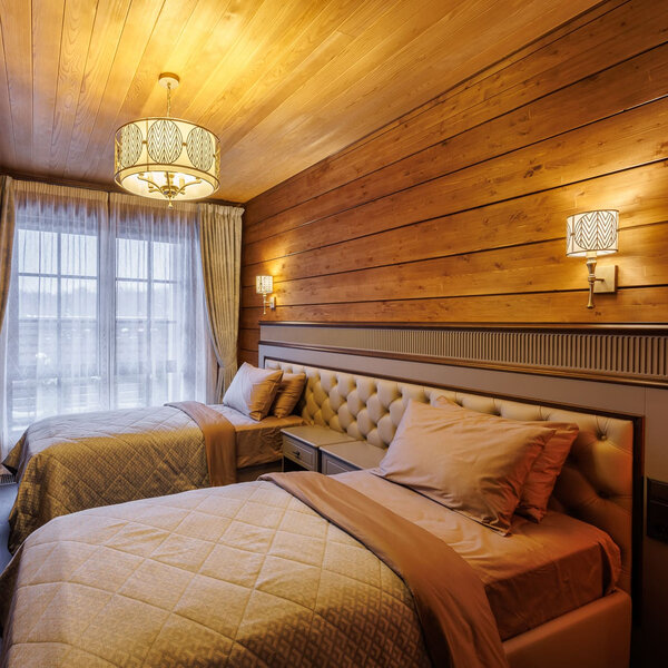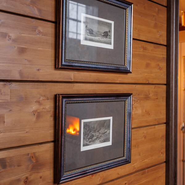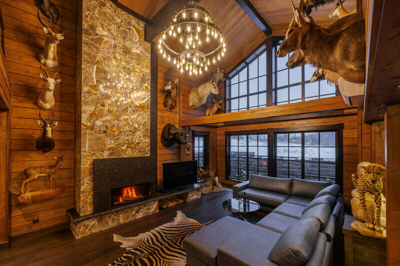 На первом этаже гостевого дома гостей «Валдайской усадьбы» встречает просторная гостиная комната с большими панорамными окнами, из которых открывается великолепный вид на первозданные леса Валдайского края. Интерьер выполнен в стиле альпийских охотничьих шале. Стены комнаты украшают трофеи из личной коллекции хозяина усадьбы.