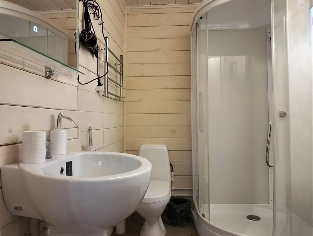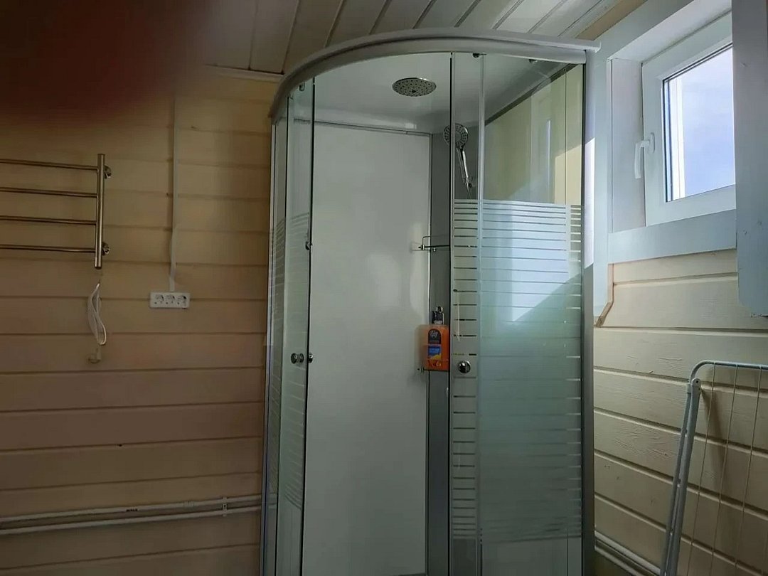 В каждой комнате по четыре кровати и по дивану, есть кухни и всё необходимое для приготовления еды, газовая плита, посуда, холодильники, комнаты светлые, окна в пол, сантехника новая. В домике усилитель мобильной связи и интернета.