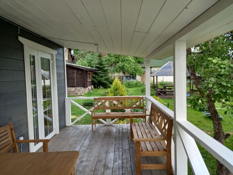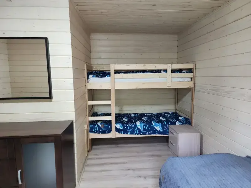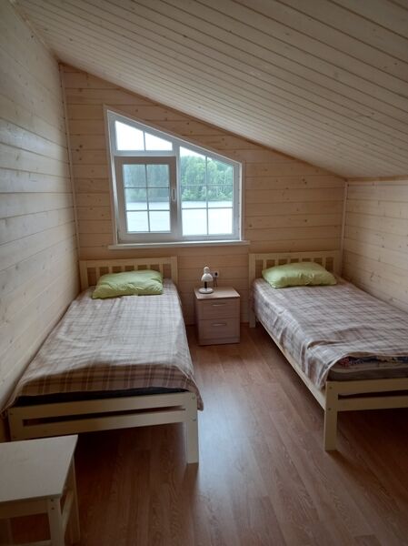 Всего в доме 2 апартамента с отдельными входами, рассчитанные на 4 взрослых + 2 детских места (двухъярусная кровать). В спальне 2 односпальные кровати, двухъярусная кровать, в кухне-гостиной - двуспальный диван.