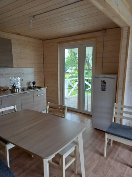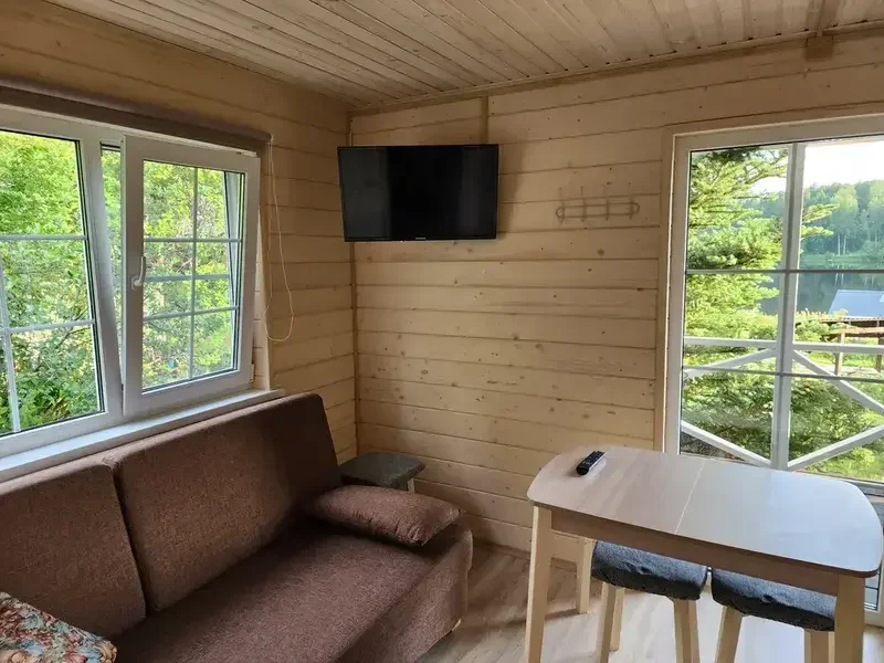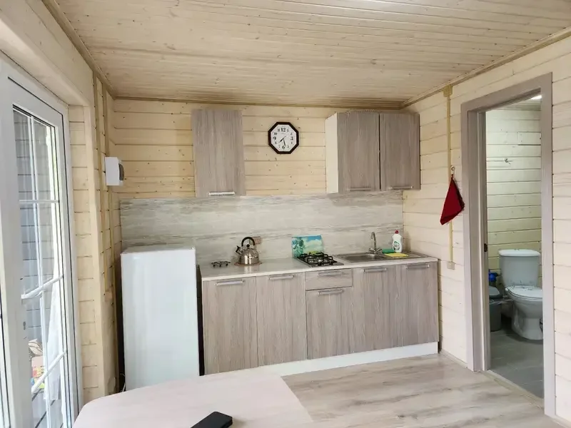 Домики оснащены необходимой техникой, мебелью и посудой. Имеется небольшая кухня. В каждом доме комфортабельный санузел с душевой кабиной.