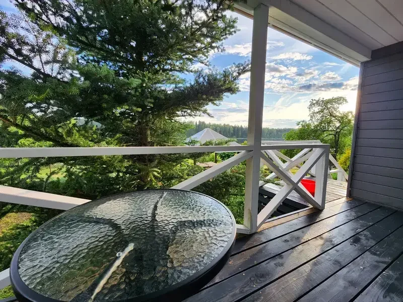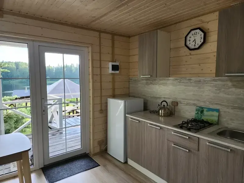 Имеется санузел, кухня со всеми необходимыми принадлежностями, панорамные окна, терраса с видом на озеро.