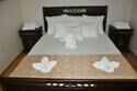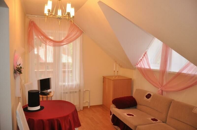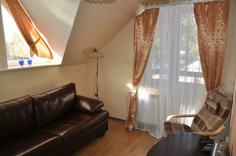 Двухкомнатный номер имеет две спальни. В первой стоит большая кровать для двоих, шкаф и тумбочки. Во второй комнате полутороспальная кровать, кресло-качалка, тумбочка с ящиками, письменный стол и стул, небольшой телевизор. В каждом номере есть выход на балкон и на оборудованный санузел с душевой.
