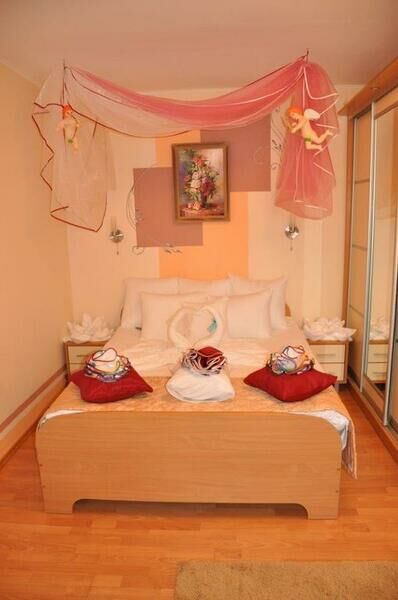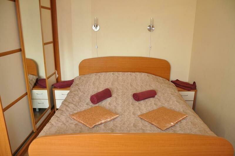 Однокомнатный номер рассчитан на двухместное проживание. Есть комнаты как с односпальной, так и с двуспальной кроватями. В спальне есть прикроватные тумбочки, шкаф-купе для одежды.