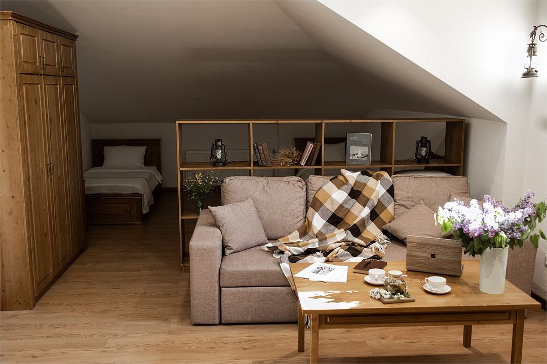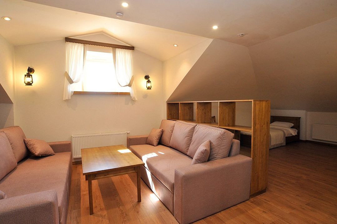 Большая гостиная, расположенная на мансарде, позволяет свободно разместить до семи человек. Две спальные зоны состоят из двух односпальных кроватей каждая, а центральная часть комнаты выделена в уютную диванную зону (диваны раскладываются в двуспальные) с большим журнальным столиком.