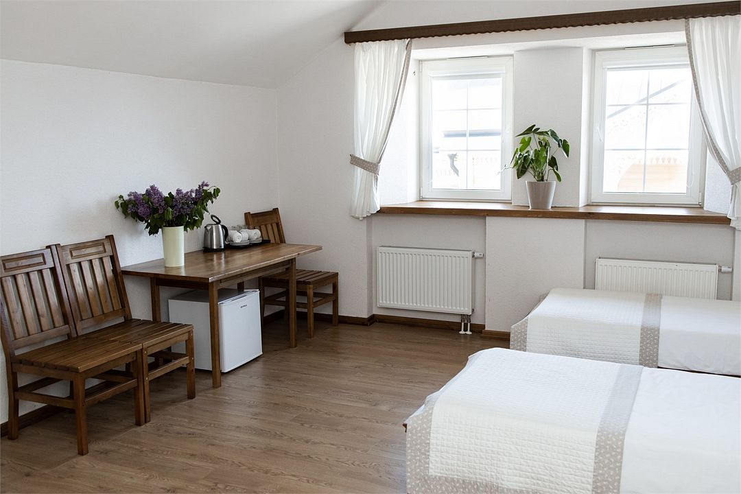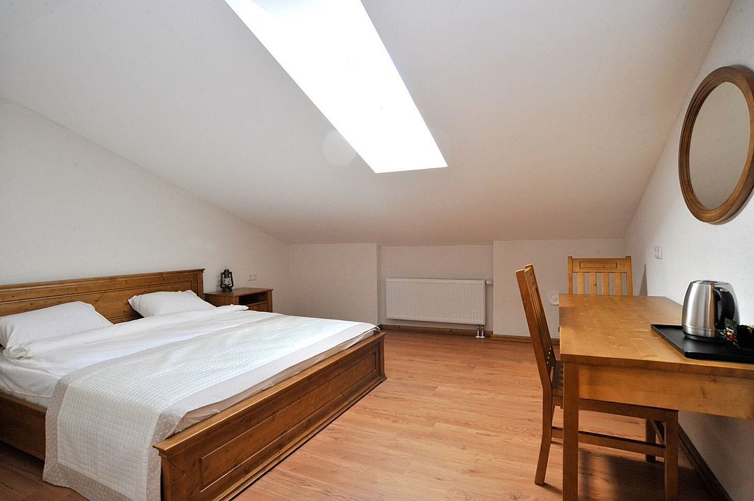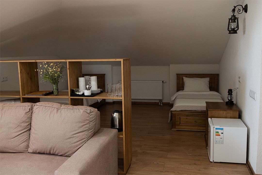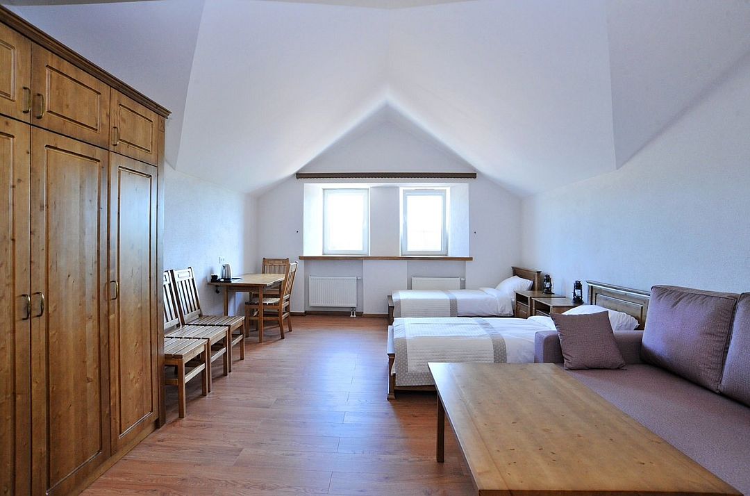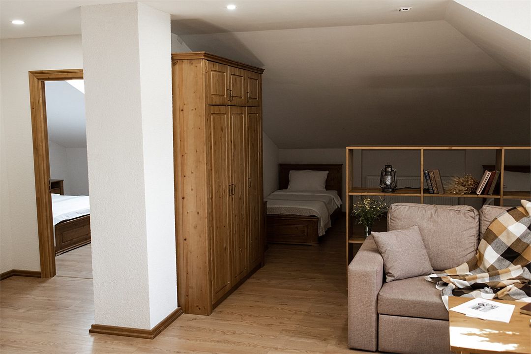 Просторный двухкомнатный номер, расположенный на мансарде, идеально подойдет для размещения семей с детьми или дружеской компании. Номер состоит из двух просторных комнат: спальни с широкой двуспальной кроватью и удобно зонированной спальни-гостиной.