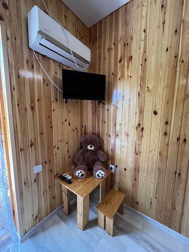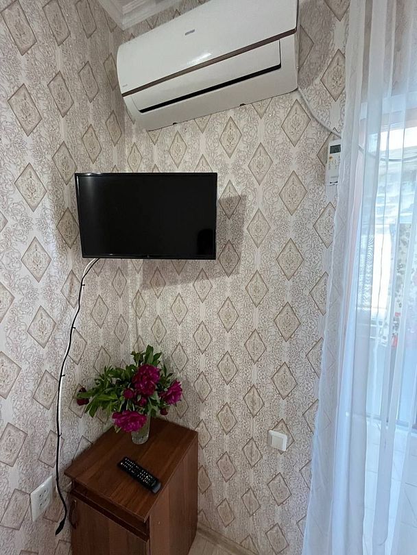 Имеется телевизор, кондиционер, шкаф, вешалка, журнальный столик, стулья.