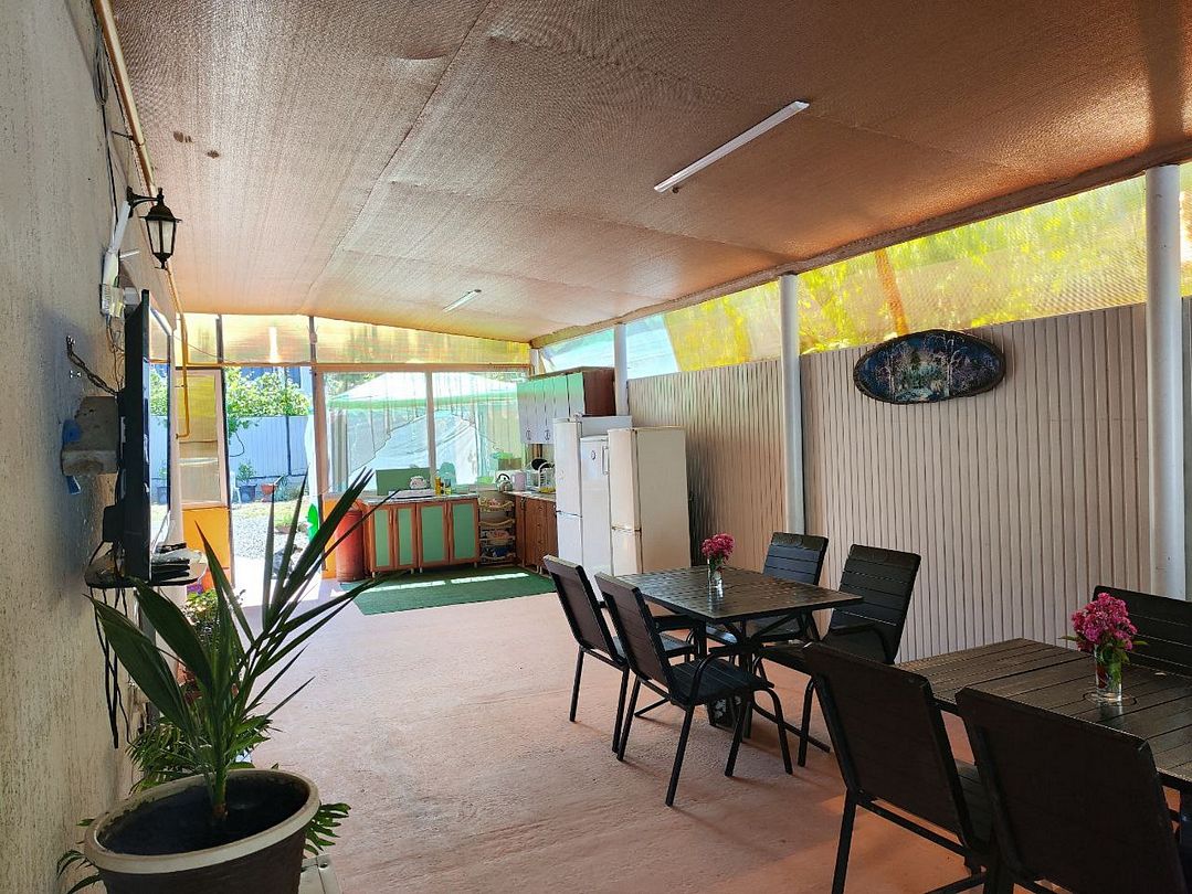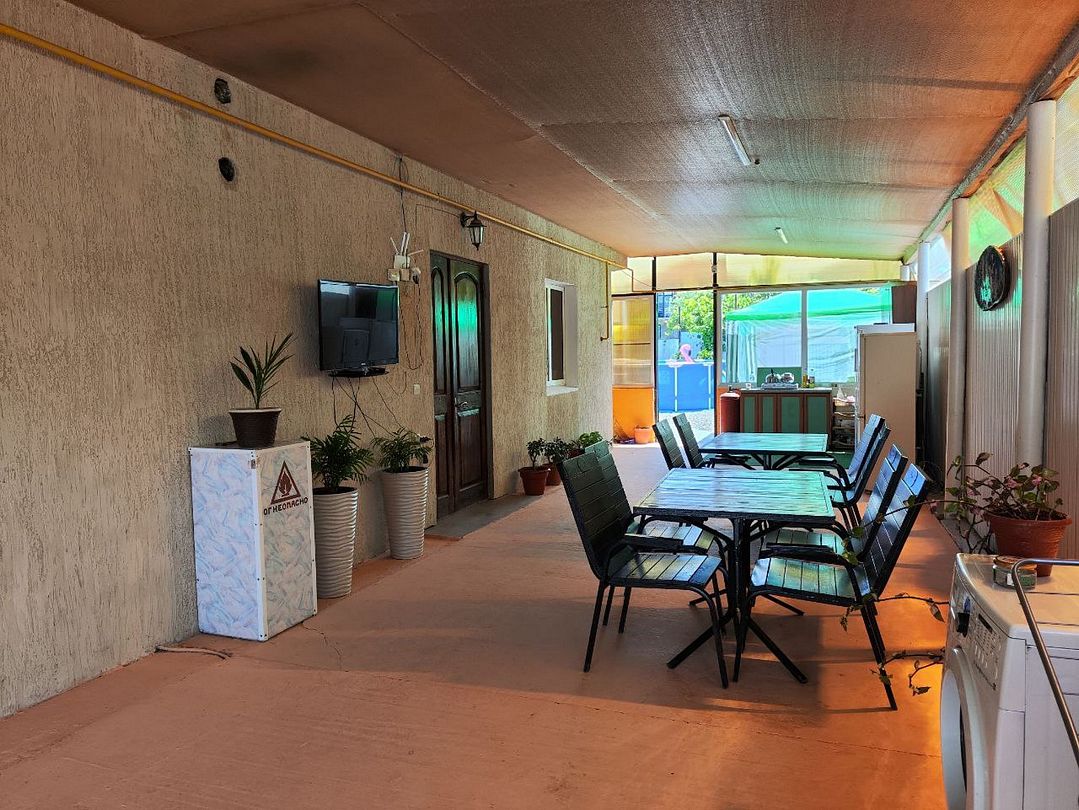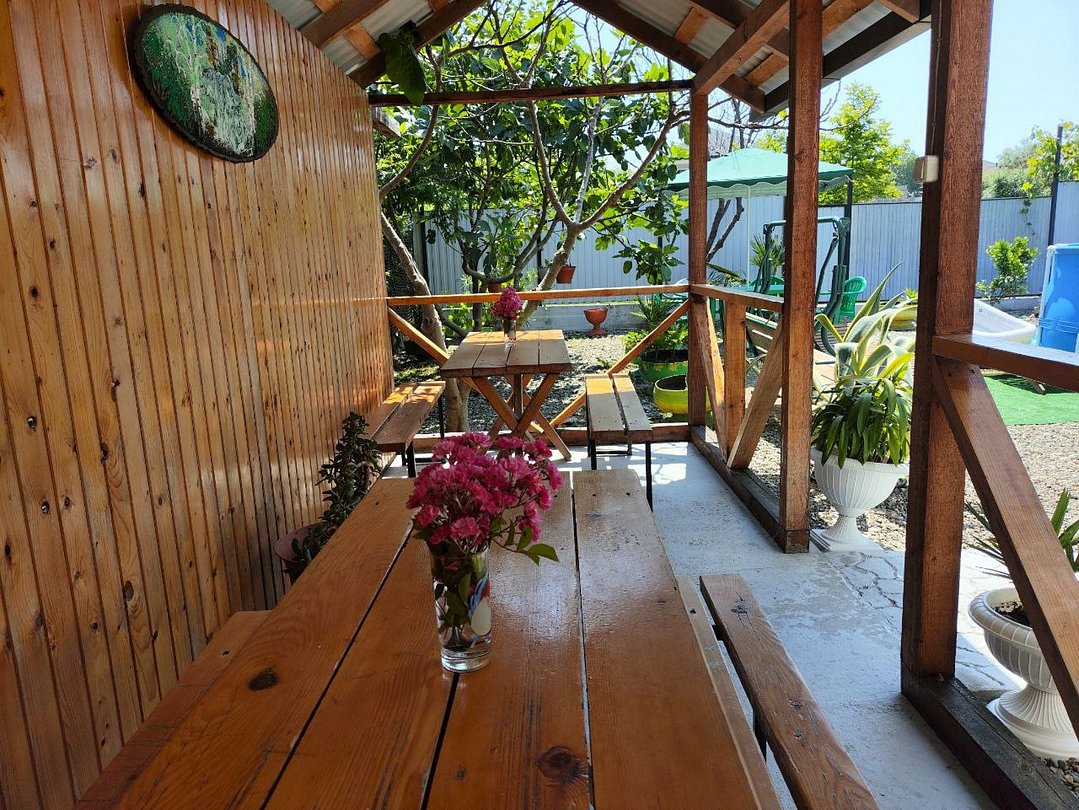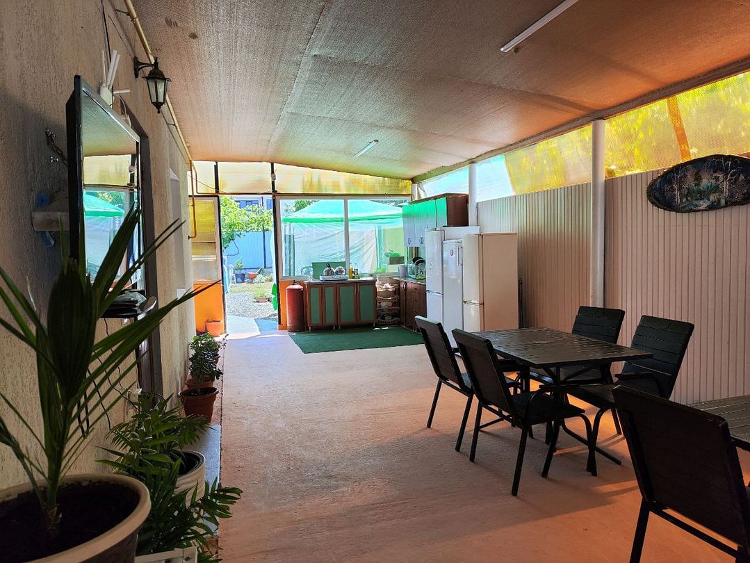 На веранде гостевого дома, защищенной от непогоды стенами и навесом, расположена оборудованная кухня, где гости могут с комфортом приготовить любимые блюда. Здесь можно расположиться за одним из столиков и насладиться трапезой, наслаждаясь отдыхом и спокойствием.