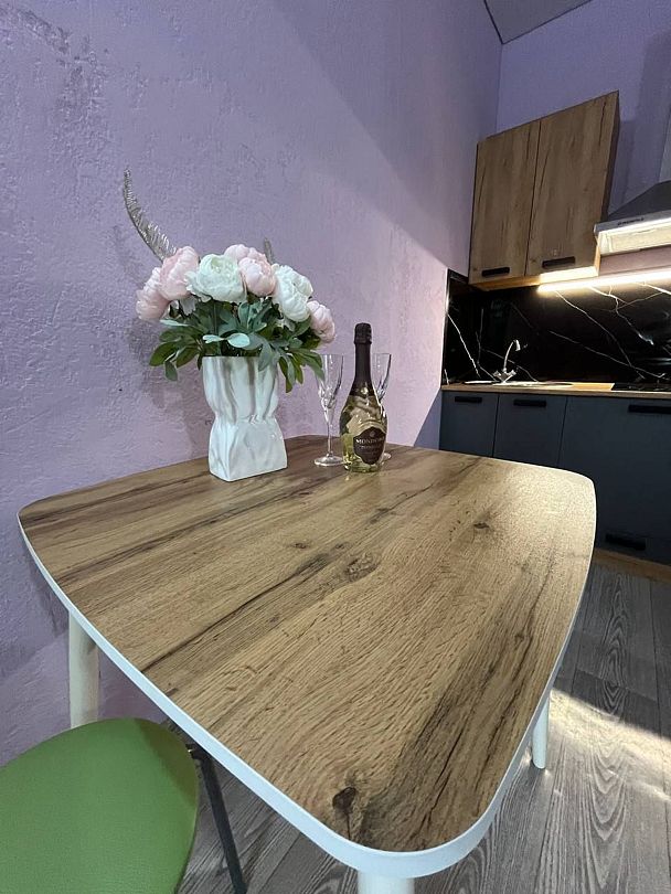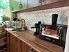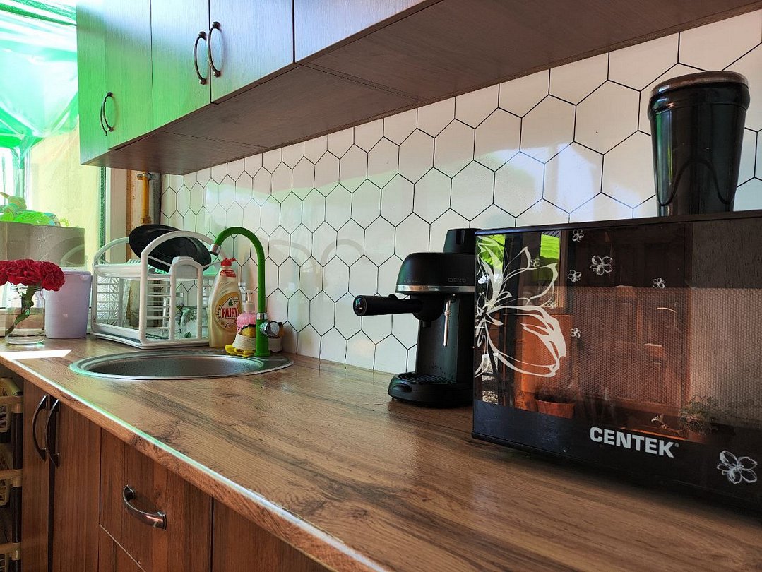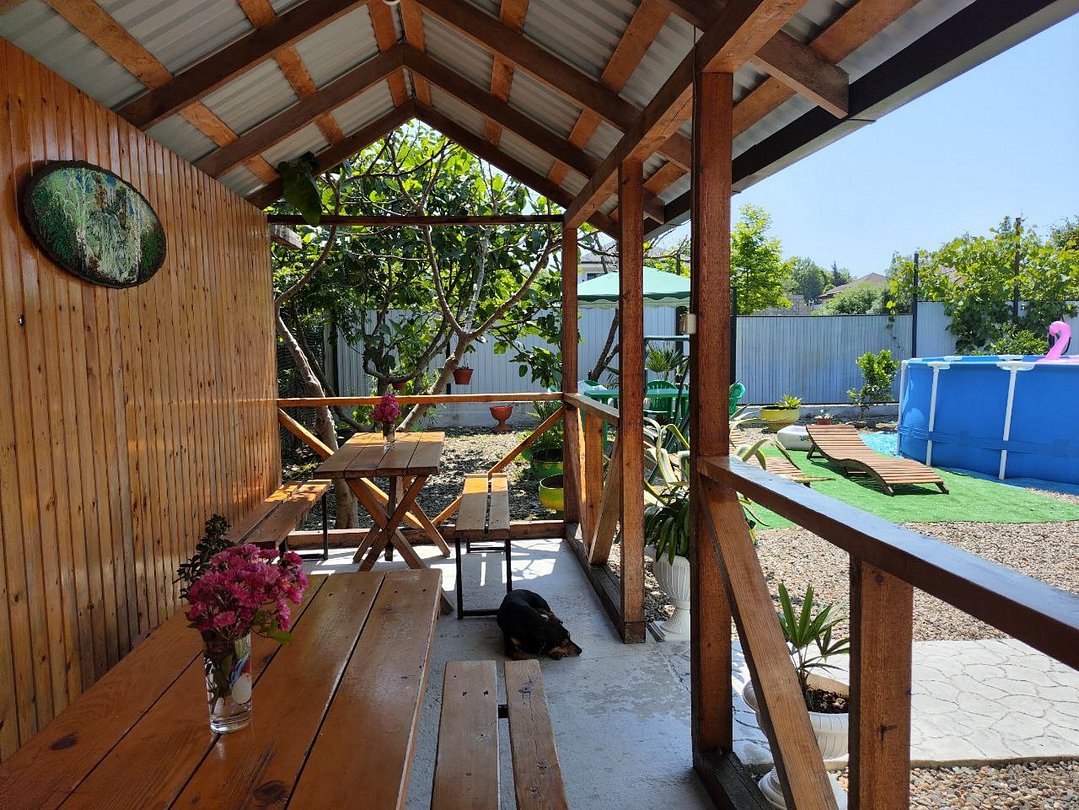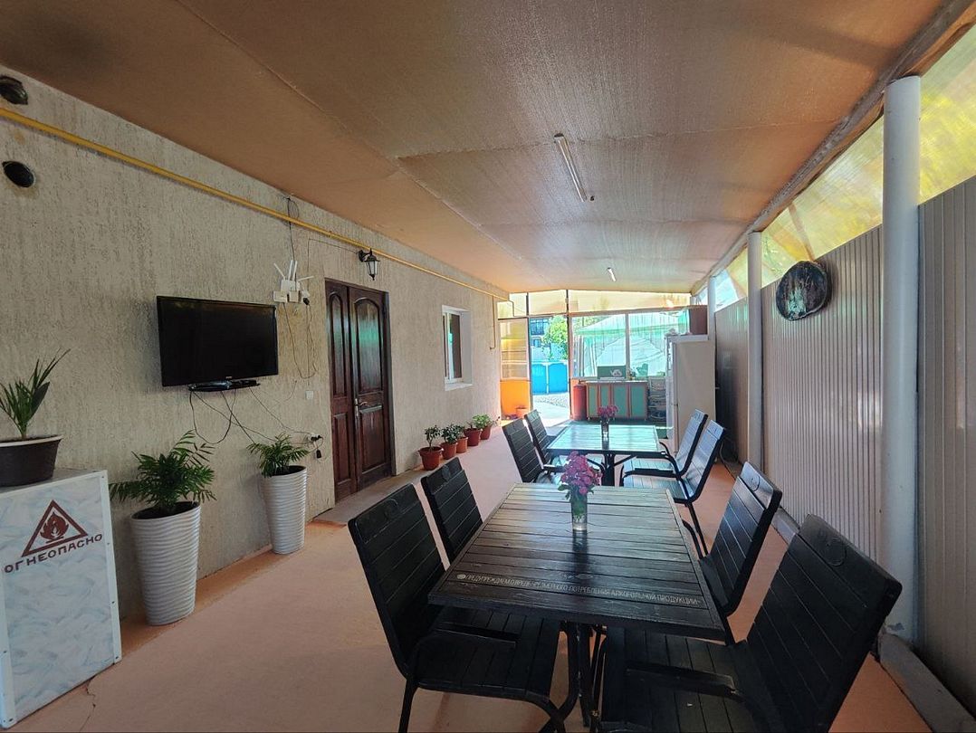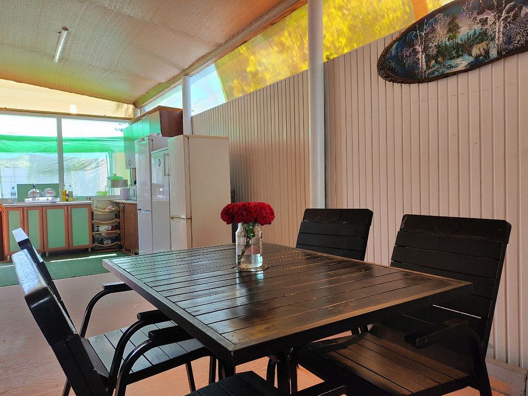 На веранде гостевого дома, защищенной от непогоды стенами и навесом, расположена оборудованная кухня, где гости могут с комфортом приготовить любимые блюда. Здесь можно расположиться за одним из столиков и насладиться трапезой, наслаждаясь отдыхом и спокойствием.
