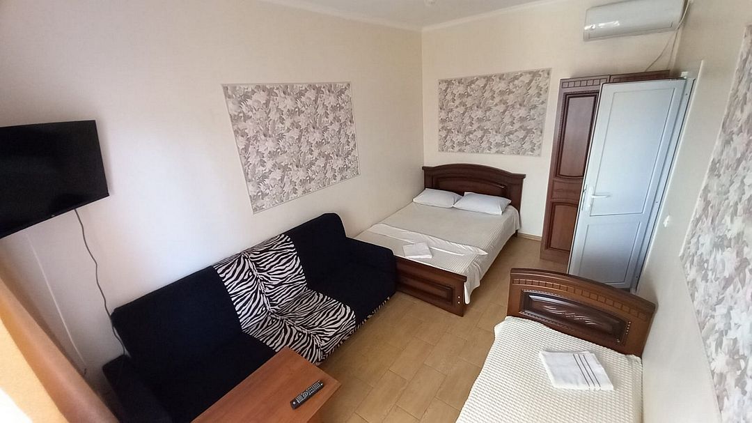 В номере: 1 двуспальная кровать, 1 диван двуспальный, 1 односпальная кровать.