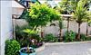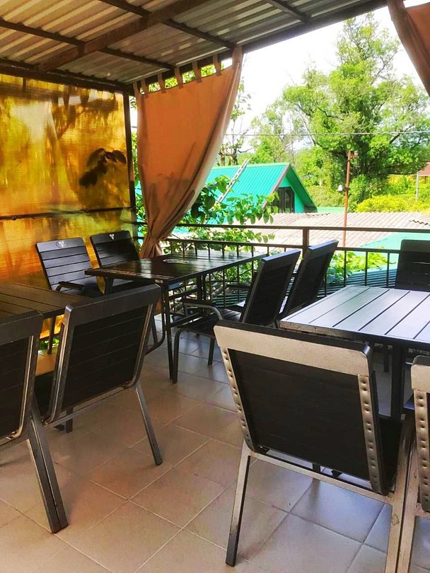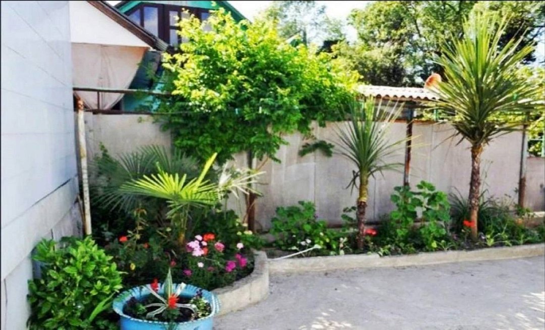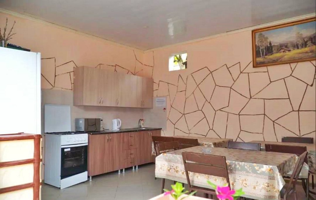 Для тех, кто предпочитает готовить самостоятельно, на территории есть общая кухня с необходимой посудой, холодильником и микроволновой печью. Здесь же расположен уютный зеленый двор с пальмами и цветами, где можно насладиться спокойствием, а также мангальная зона для вечерних посиделок. Во дворе предусмотрена парковка, что делает пребывание еще более удобным.