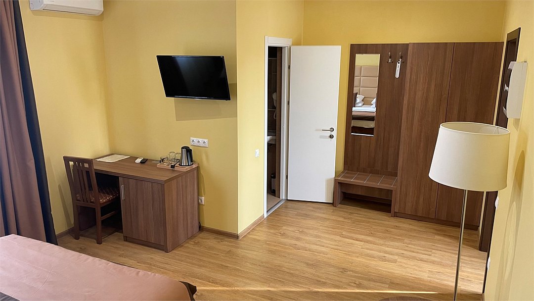 два телевизора, Wi-Fi, интернет, кондиционер, система климат-контроля, светильник, фен, система безопасности, обогреватель, санузел, банные полотенца, гигиенические средства, косметические средства, две односпальные или большая двуспальная кровать, гипоаллергенное белье, тумбы, шкаф для одежды, вешалки, журнальный столик, письменный стол, багажная тумба, зеркало, две комнаты, чайный набор, чайник, унитаз, раковина, питьевая вода, гостиная зона, отдельный вход в номер, душ, вид во двор, стаканы, кофейный столик, стул, туалетные средства, сплит-система, цифровое тв, диван-кровать, раскладной диван, телевизор с плоским экраном, мини-холодильник, москитная сетка, телевизор со Smart TV, номер для некурящих, мылоВ гостиничном номере