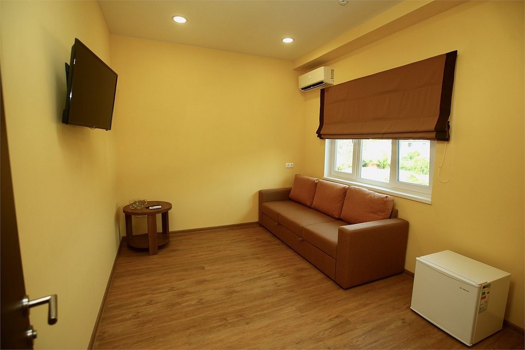 Комфортный двухкомнатный номер на 1 этаже со своим входом. До 5 мест. В номере есть 2 комнаты, прихожая, санузел, 2 кондиционера, 2 ТВ, мини-холодильник, чайный набор, фен, двуспальная кровать, раскладной диван, шкаф, входная группа, рабочий стол, журнальный стол, свежее постельное белье и полотенца, гигиенические принадлежности.Услуги и удобства