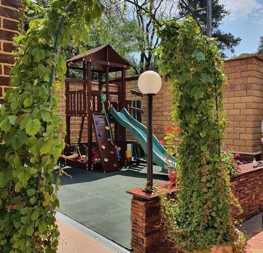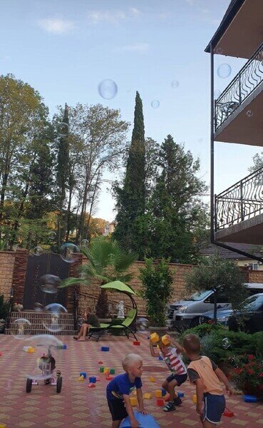 На территории гостевого дома есть детская площадка, игрушки и батут, вся территория под видео наблюдением, дети могут быть на площадке, а родители — находиться рядом в зоне отдыха.