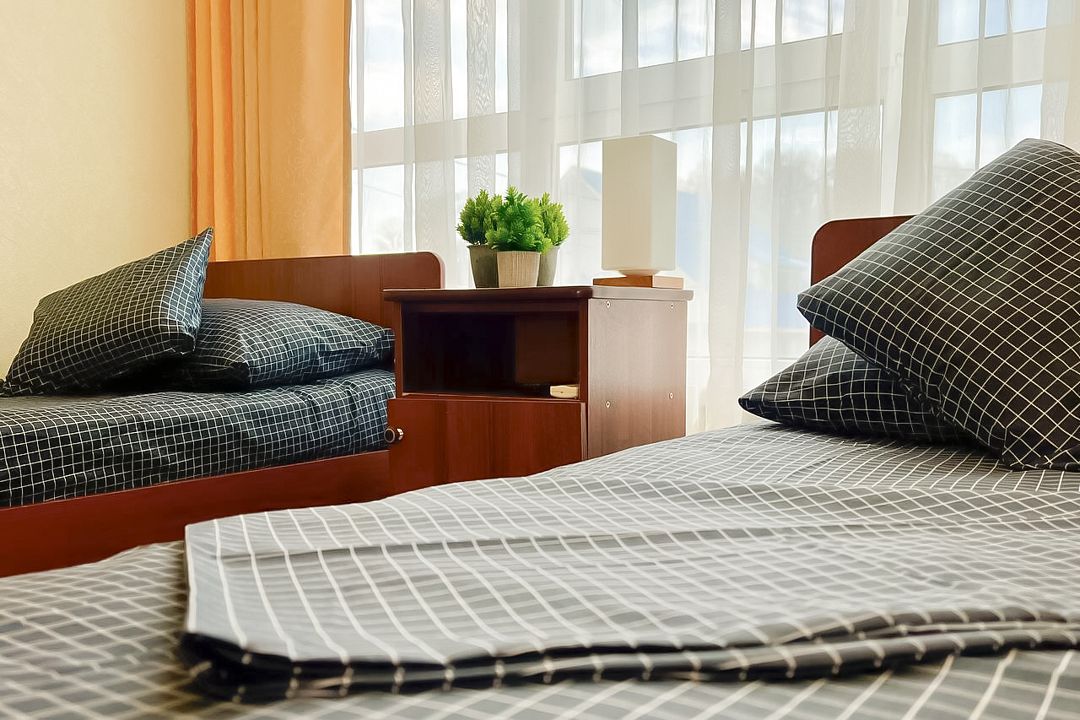 Две односпальные кровати, одна двуспальная кроватьВ гостиничном номере