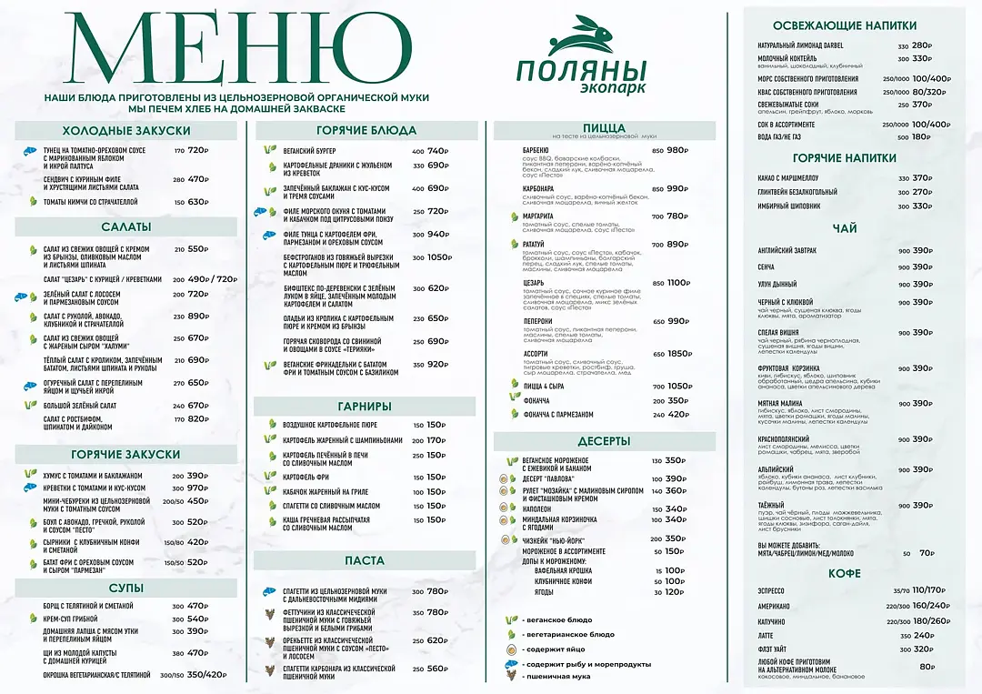 В комплексе организуется питание, помимо этого на территории работают три кафе с вкусными и разнообразными блюдами, имеется даже вегетарианское меню.