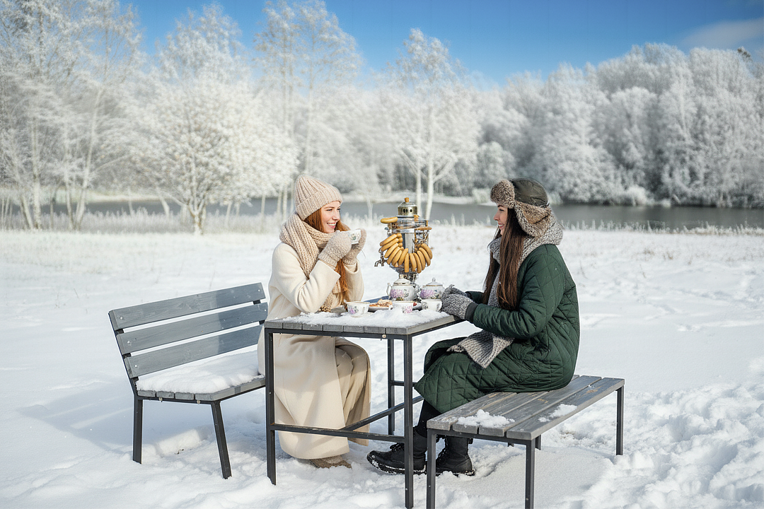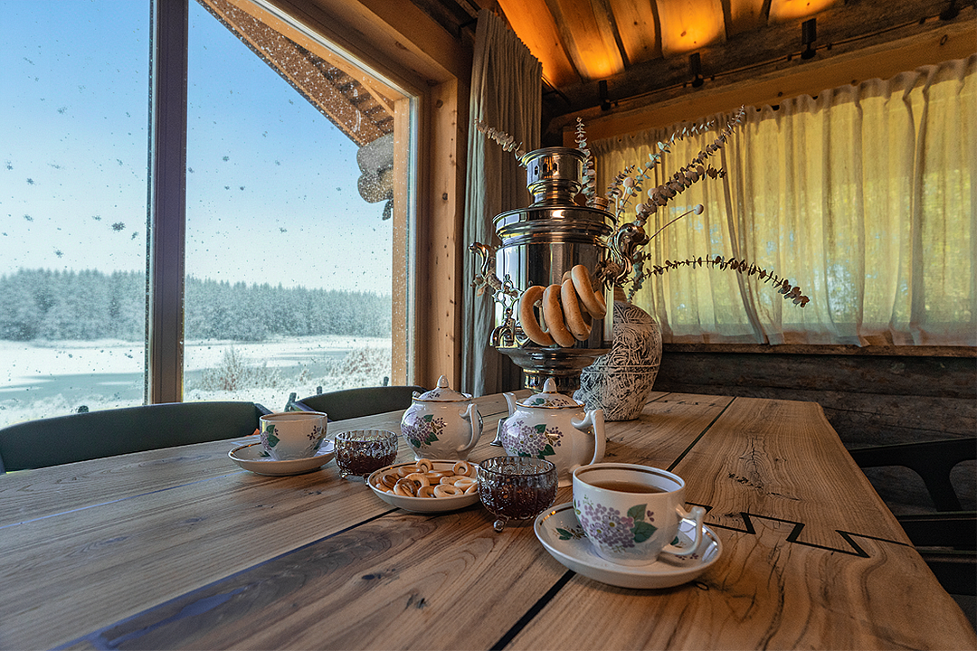 В глэмпинге гостей ждет сюрприз — настоящий русский самовар на дровах. Он станет центром вашего чаепития, а команда позаботится о том, чтобы все было идеально — накроют стол элегантной скатертью и предложат старинный чайный сервиз, хранящий множество историй.