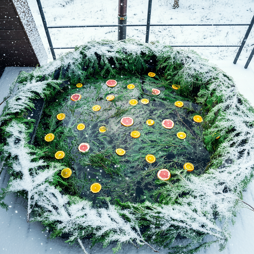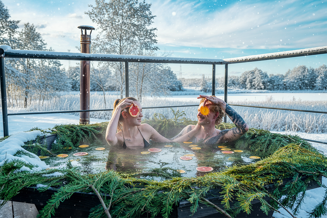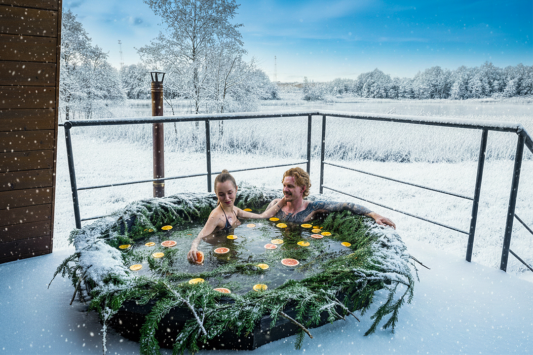 В глэмпинг парке вас ждет незабываемое времяпровождение в горячем банном чане. Наполненный кристально чистой водой и подогретый до 38–42 °C, он станет великолепным дополнением вашего отдыха. В зимнее время вы сможете наслаждаться этим удовольствием в течение 2–4 часов, а в теплые дни — с утра до вечера.