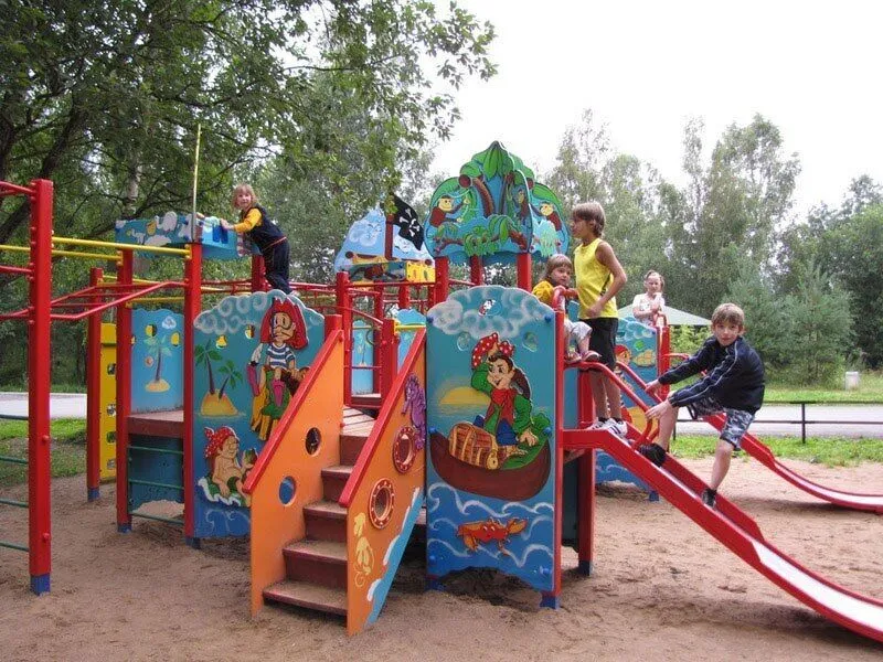 Читать полностьюБольшая детская игровая площадка с качелями, горками, балансирами и большой песочницей.