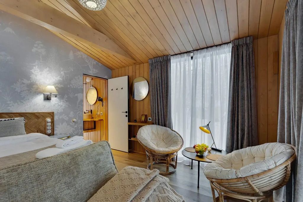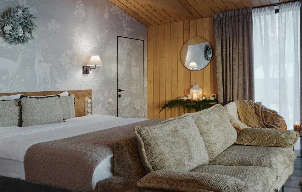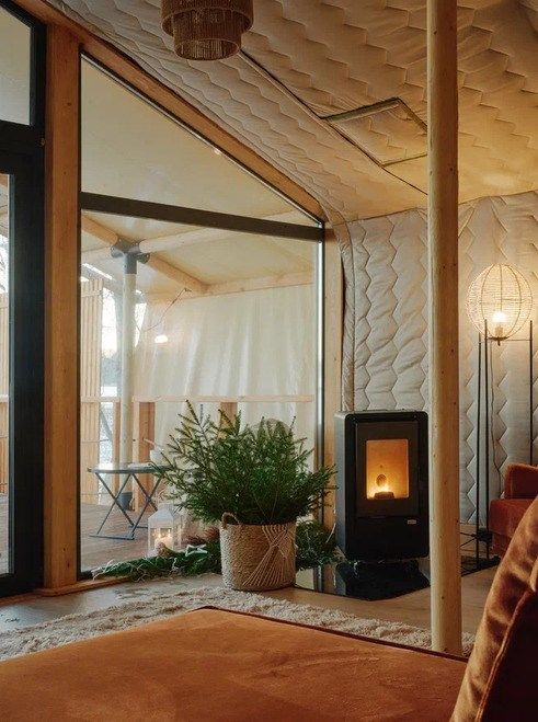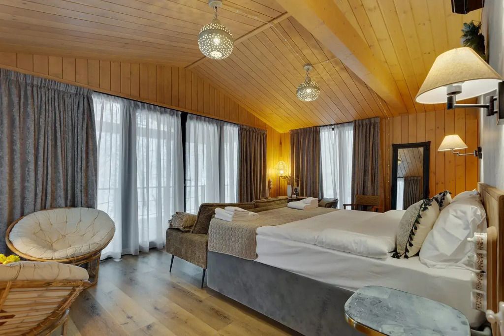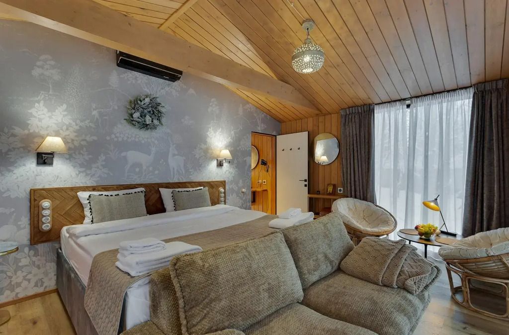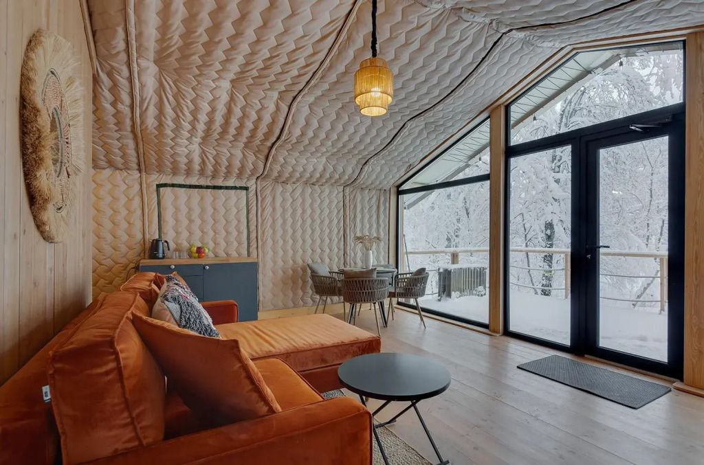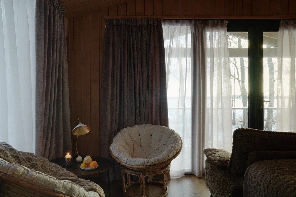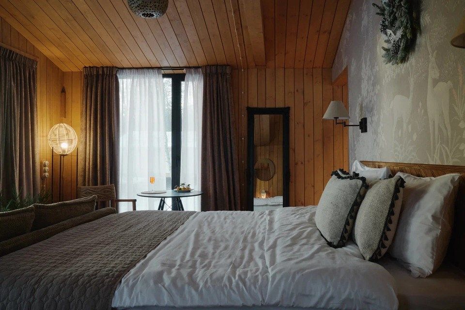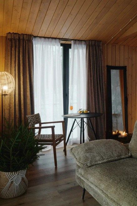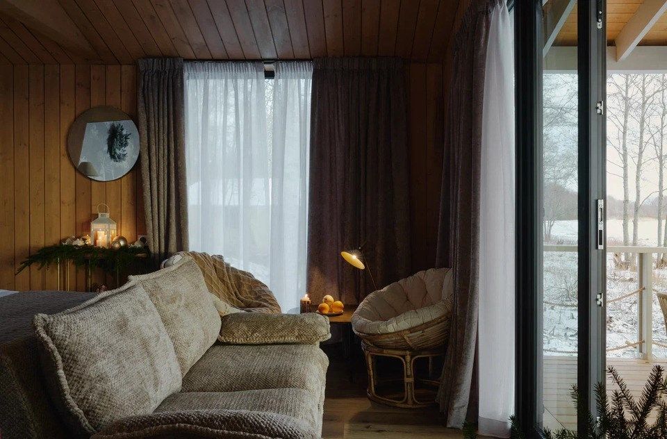 Интерьер лоджа выполнен из натурального дерева. Большие панорамные окна, стирающие грань между домом и лесом. Кровать в уютной нише и диван у огня — всё продумано для жизни в гармонии с собой.
