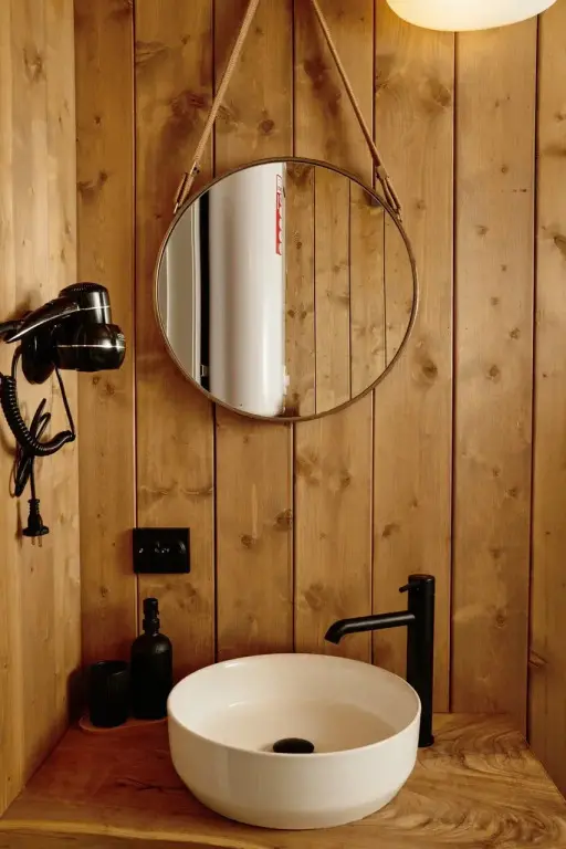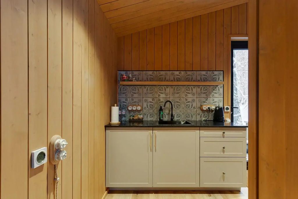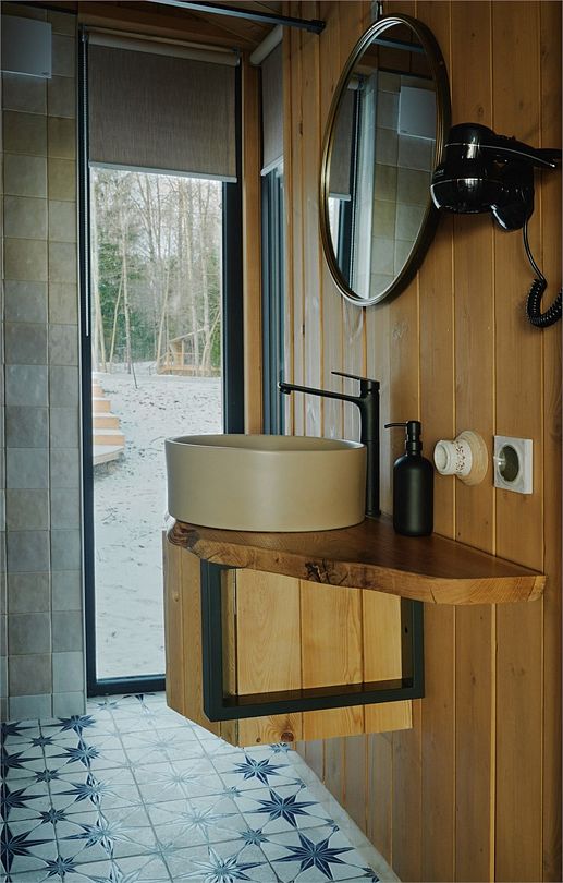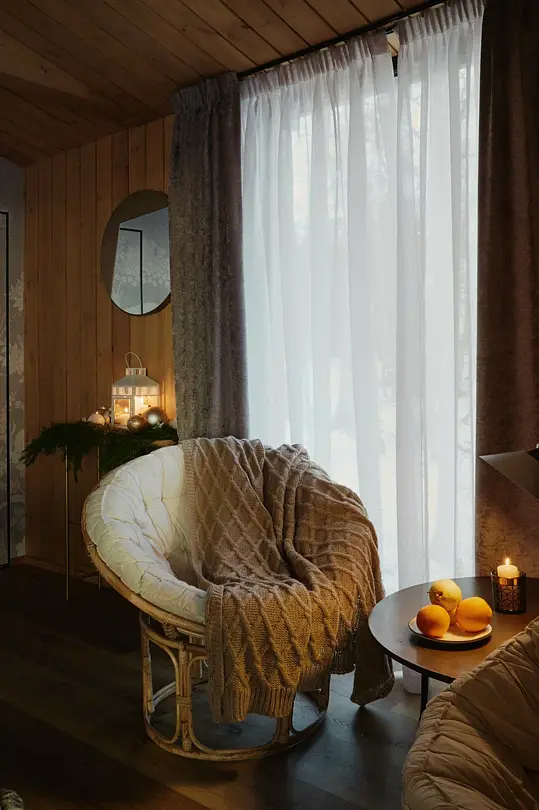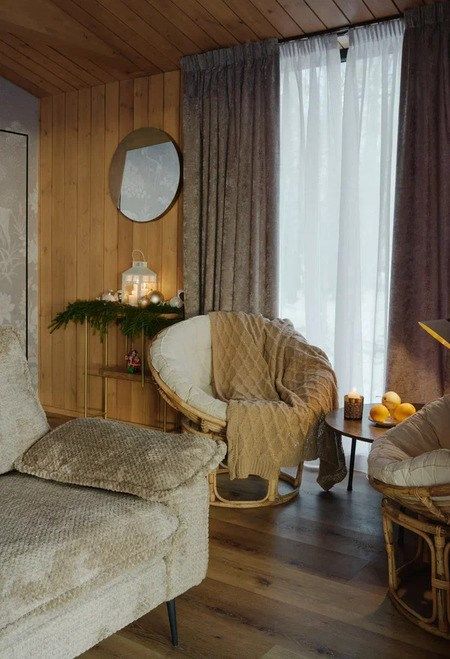 Затерянный в гуще леса, вдали от туристических троп и соседних построек, этот уютный лодж площадью 36 м² — идеальный побег для тех, кто ищет диалог с природой. Здесь — только деревья, шепот ветра в кронах и пение птиц, нарушающее благородную тишину. Ваш личный уголок дикой природы. Просыпайтесь под мягкий свет, пробивающийся сквозь хвойные ветви, вдыхайте смолистый аромат леса и слушайте пение птиц. Интерьер лоджа выполнен из натурального дерева. Большие панорамные окна, стирающие грань между домом и лесом. Кровать в уютной нише и диван у огня — всё продумано для жизни в гармонии с собой.