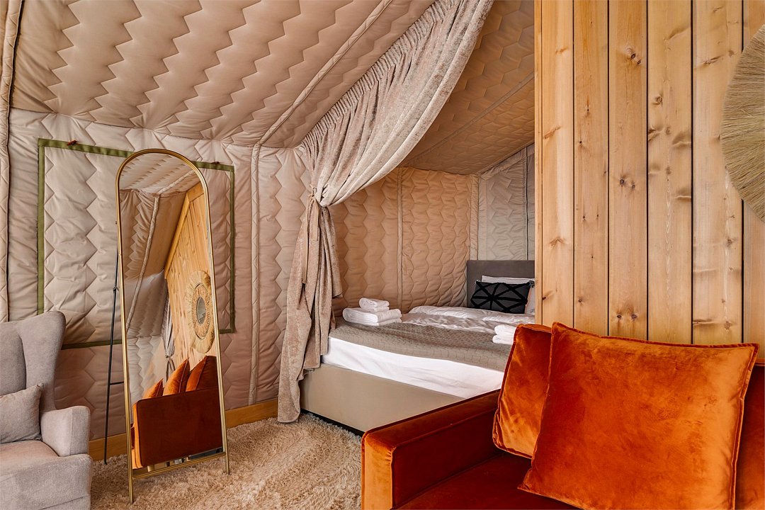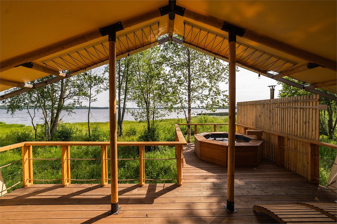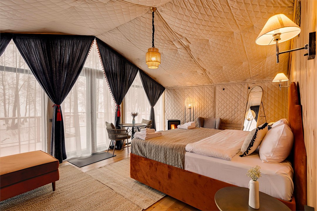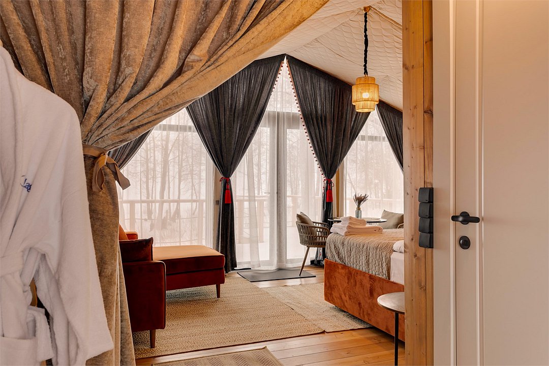 Лодж в сафари-стиле с роскошным видом на озеро, панорамными окнами, уединенной террасой. В просторной комнате большая двуспальная кровать, в зоне отдыха удобный раскладной диван, печь-камин, создающая уютную атмосферу. Современная просторная ванная комната. В качестве дополнительной услуги организуем дизайн ванной комнаты в романтическом стиле, чтобы сделать ваше пребывание ещё более волшебным. В стоимость проживания включены завтрак, премиальные постельные принадлежности, экологичная косметика, вода, чай. Основных мест для размещения- 2. Дополнительных- 2 (на раскладном диване). В лодже возможно проживание с собаками до 30 см в холке и не больше 7 кг. Проживание с питомцем дополнительно оплачивается.Услуги и удобства