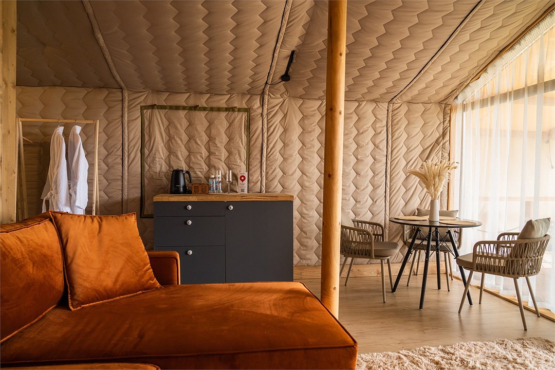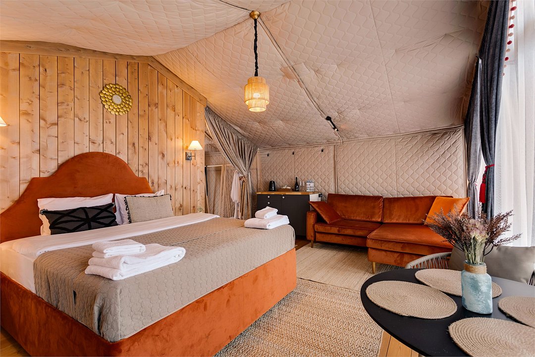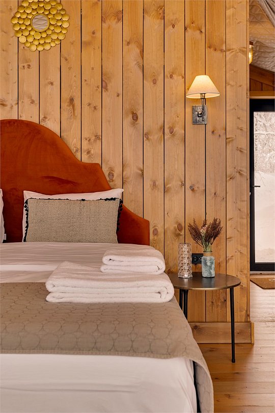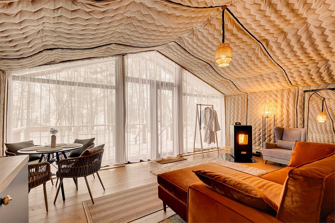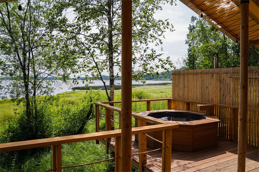 Лодж в сафари-стиле с роскошным видом на озеро, панорамными окнами, уединенной террасой. В просторной комнате большая двуспальная кровать, в зоне отдыха удобный раскладной диван, печь-камин, создающая уютную атмосферу. Современная просторная ванная комната. В качестве дополнительной услуги организуем дизайн ванной комнаты в романтическом стиле, чтобы сделать ваше пребывание ещё более волшебным. В стоимость проживания включены завтрак, премиальные постельные принадлежности, экологичная косметика, вода, чай. Основных мест для размещения- 2. Дополнительных- 2 (на раскладном диване). В лодже возможно проживание с собаками до 30 см в холке и не больше 7 кг. Проживание с питомцем дополнительно оплачивается.Услуги и удобства