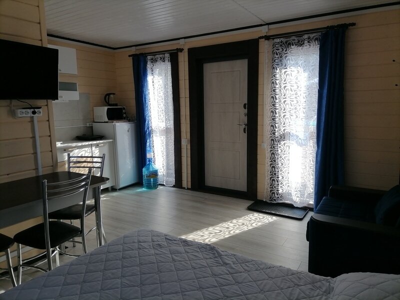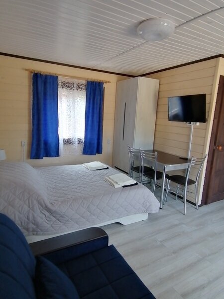 Дом №1. Идеально подойдет молодой паре для спокойного и уютного отдыха. Коттедж рассчитан от 1 до 3 человек. В доме один этаж, расположена комфортная двуспальная кровать и раскладной диван. Установлен кондиционер, ещё один плюс для комфортного проживания. Мини-кухня со всем необходимым, санузел и душ. Рядом детская и спортивная площадки. В пешей доступности река Ока с песчаным пляжем.