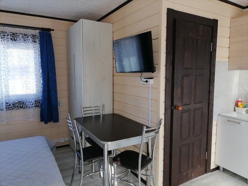 Дом №3. Идеально подойдет молодой паре для спокойного и уютного отдыха. Коттедж рассчитан от 1 до 3 человек. В доме один этаж, расположена комфортная двухспальная кровать и раскладной диван. Установлен кондиционер, ещё один плюс для комфортного проживания. Мини-кухня со всем необходимым, санузел и душ. Рядом детская и спортивная площадки. В пешей доступности река Ока с песчаным пляжем.