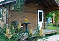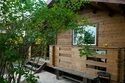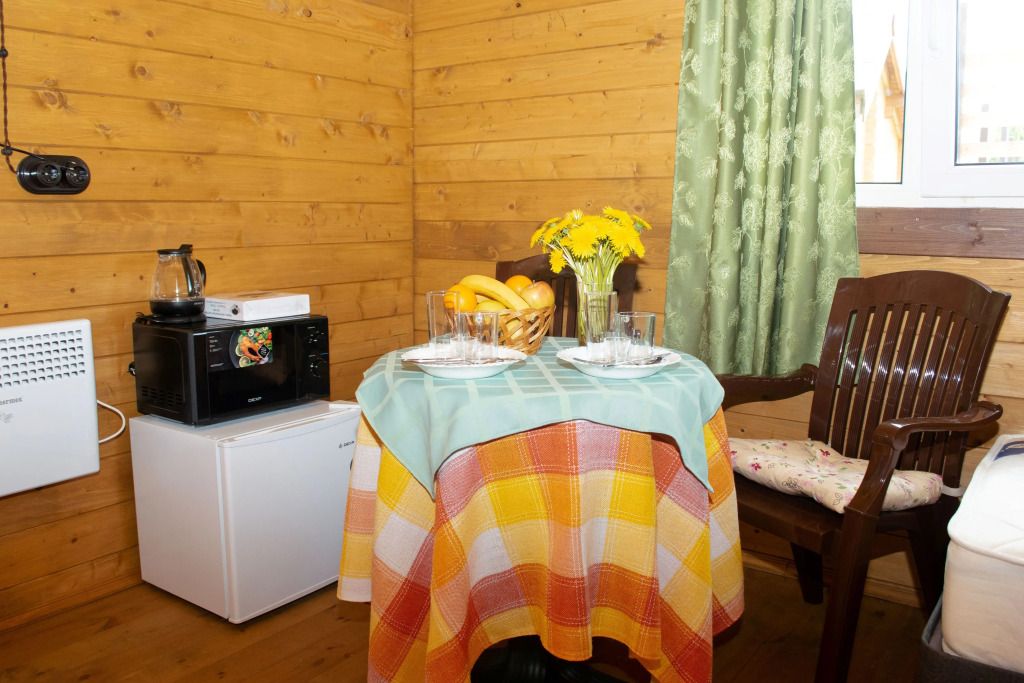 Одноэтажный с отдельным входом и небольшой открытой верандой для отдыха. Рассчитан на проживание 2-х человек. Две полуторные кровати (можно сдвинуть), прикроватные тумбочки, стол, стулья, большой ТВ, Холодильник, СВЧ, электрический чайник и электроплитка с необходимым набором посуды для самостоятельного приготовления пищи. Санузел с душевой кабиной, водонагреватель. На улице имеется индивидуальный мангал.