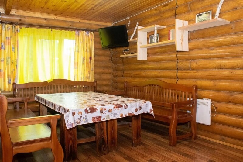 Двухэтажный с отдельным входом и закрытой просторной уличной беседкой для отдыха. Рассчитан на проживание до 18-ти человек. На первом этаже большая гостиная с обеденным столом и стульями, две кухни с необходимым набором посуды для самостоятельного приготовления пищи, Холодильник, СВЧ, электрический чайник и электроплитка, двуспальный диван, большой ТВ. В коттедже на первом этаже русская баня на дровах. Два санузла с душевыми и обливочным ведром. На втором этаже четыре раздельные спальни, в одной две полуторные кровати (можно сдвинуть), прикроватные тумбочки, в другой двухспальная кровать и полуторная. Так же, на втором этаже два двуспальных дивана. На улице, огромная крытая беседка с освещением и индивидуальный мангал.